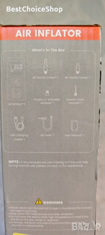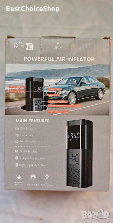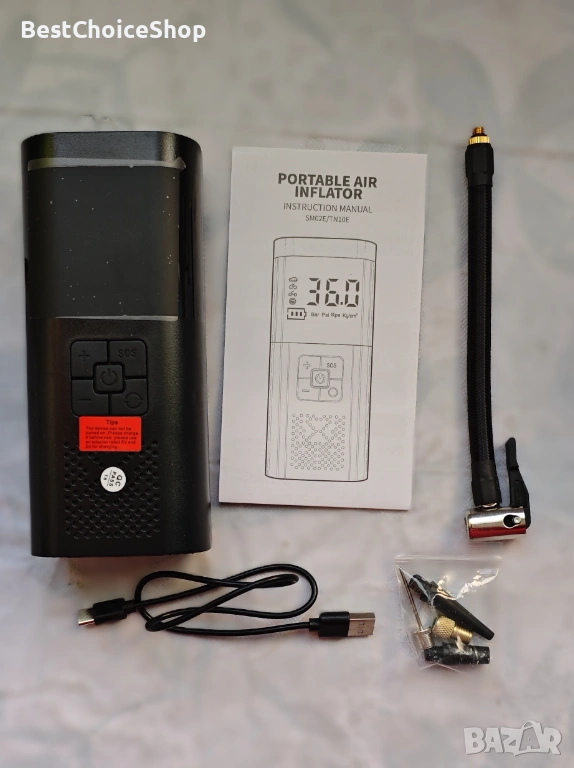 - Функции: Дигитален манометър и LED светлина с режими за осветление/SOS.