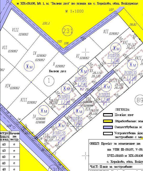 Имотът е УПИ. Плътност на застрояване 55%, КИНТ - 1,2, кота корниз - 10м. Идентификаторният номер под който може да бъде намерен в интернет сайта на Кадастъра е 77246.29.133. Правилна правоъгълна форма. Размери 20м. на 45м. Парцелът позволява изграждането на една голяма или на две по-малки къщи в него. Канализация в селото няма, водата и ток към момента не са прокарани, в съседните имоти има, вижда се на снимките. Граничи с новопостроени къщи. Много хубава панорама. Независим достъп чрез тупик. Градоустройствените параметри за района позволяват да се направи при желание къща с РЗП над 1000кв. м. на този парцел. Много добър транспортен достъп до селото по пътя от София към Калотина. Погледнете картата в обявата за точното местоположение.