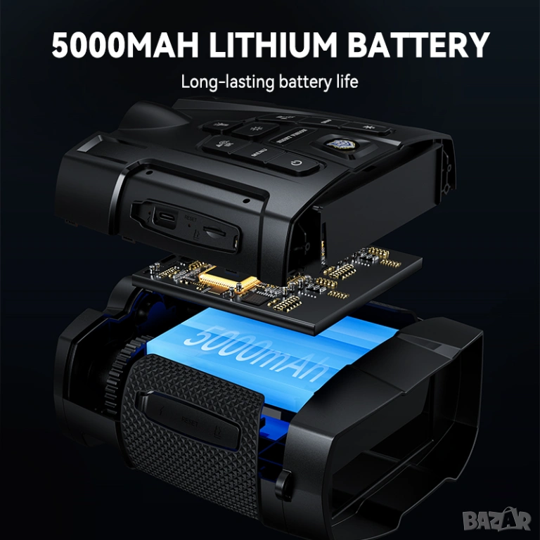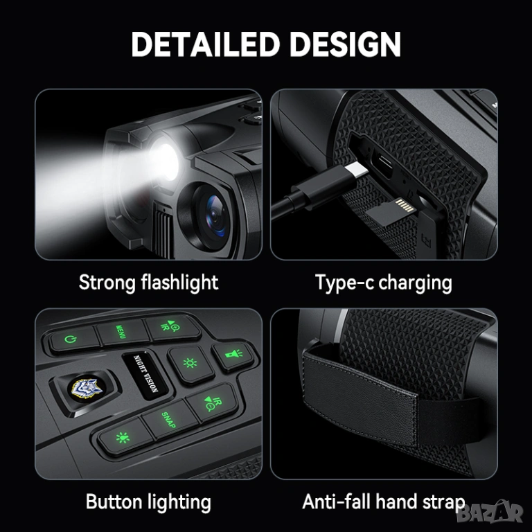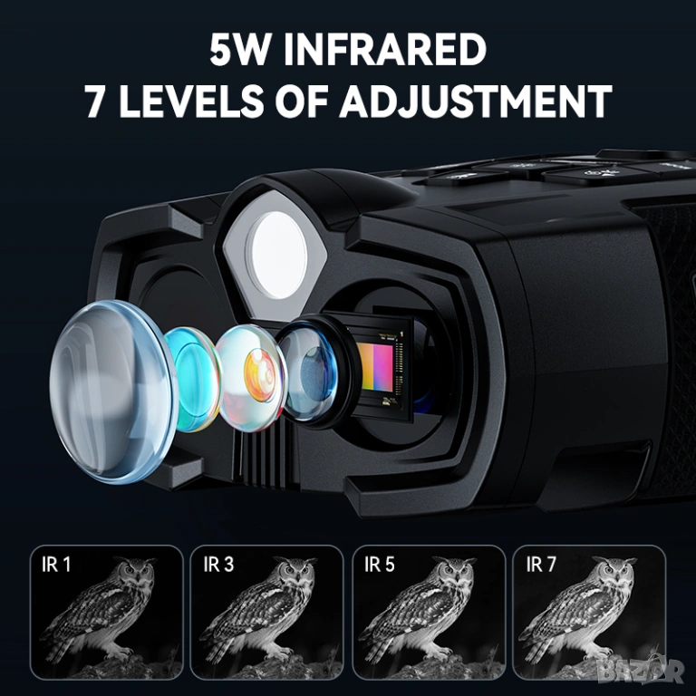 Бинокълът използва високочувствителен CMOS сензор и регулируемо IR инфрачервено осветление (850 nm), което позволява наблюдение на обекти на разстояние до около 800 m в пълна тъмнина. Освен това устройството предлага 10× цифрово увеличение и възможност за запис на изображения и видео върху TF карта памет.