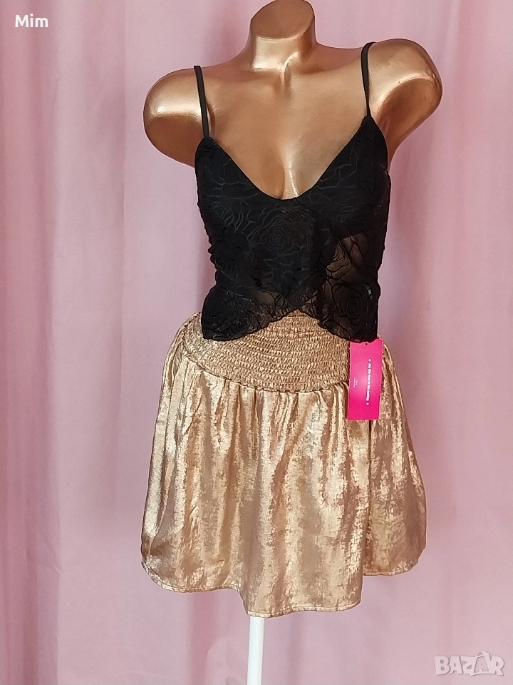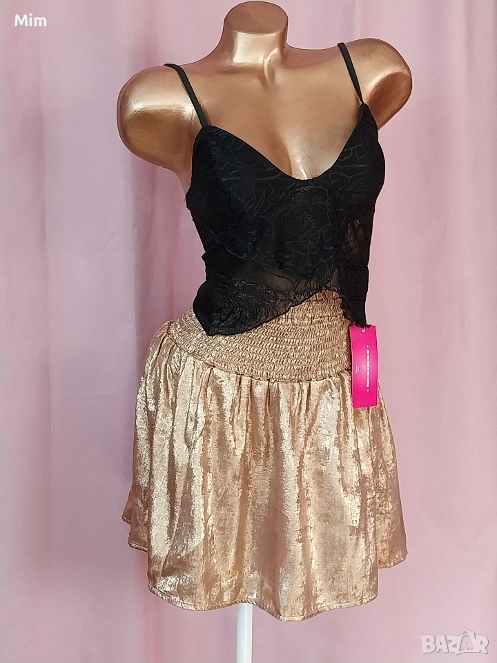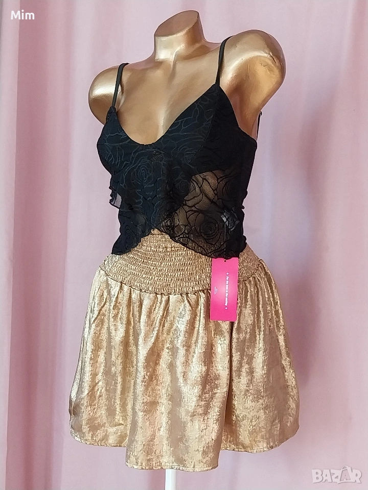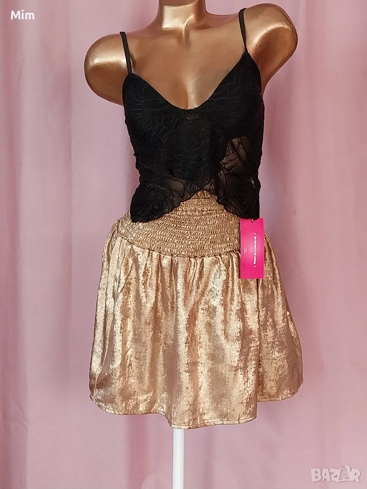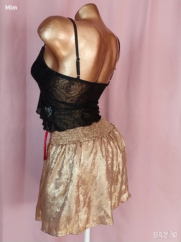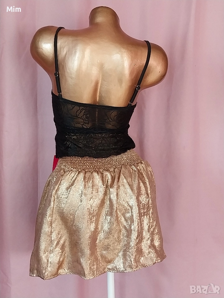 2- Златиста пола от тънък сатан в талията с широк ластичен колан от 60 до 100 см еластичност, дължина 40 см