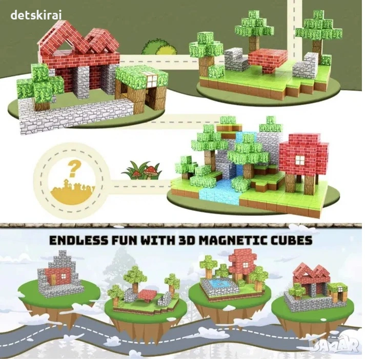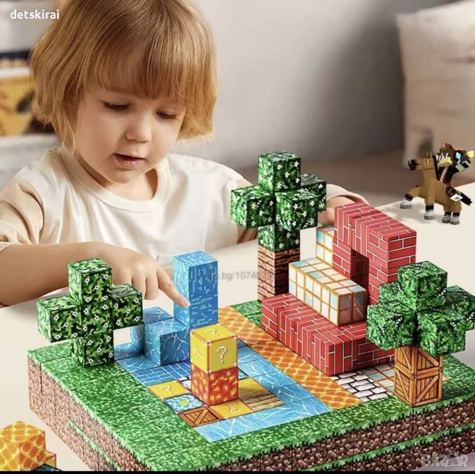 Всички комплекти магнитни кубчета в стил Minecraft – конструктор за деца с 50 части се предлагат в удобна кутия за съхранение, която помага за подреждане и лесно прибиране след игра. В комплекта е включена и книжка с идеи за строене, която дава насоки как детето може да започне – от основни конструкции до по-сложни постройки, вдъхновени от Minecraft света.