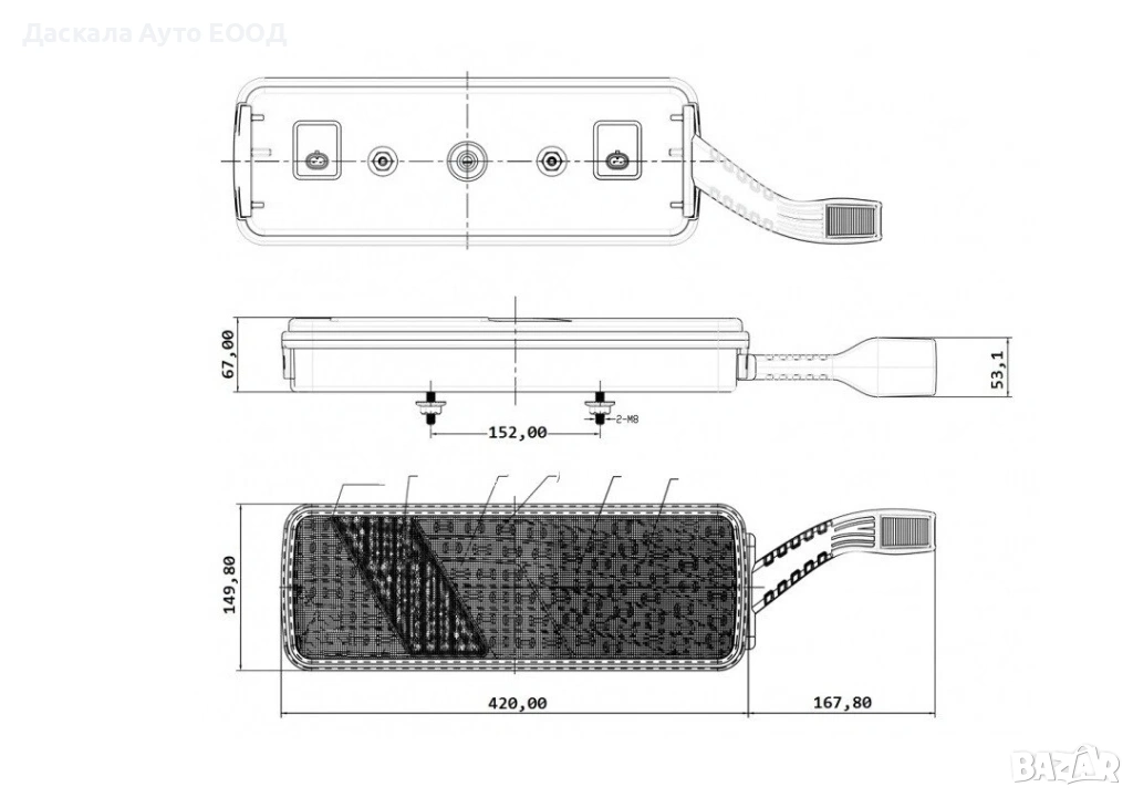 Размери на задната светлина: 42см дължина, 15см ширина, 6,7см дебелина