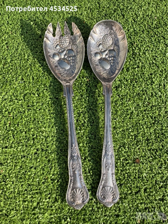 Елегантен комплект за сервиране на салата в класическия Kings Pattern стил с богата релефна орнаментика. Работната част е декорирана с плодови мотиви (грозде и листа), а дръжките завършват с характерна мида.