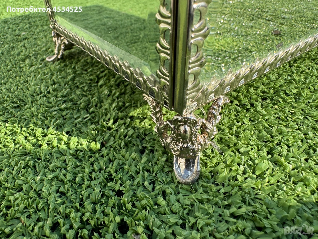 Огледална кутия за бижута или аксесоари, изпълнена в изискан стил Hollywood Regency. Съчетанието на фасетирани огледални панели и богато орнаментиран метален обков придава луксозна и много ефектна визия, която се вписва прекрасно както в класически, така и в модерен интериор.