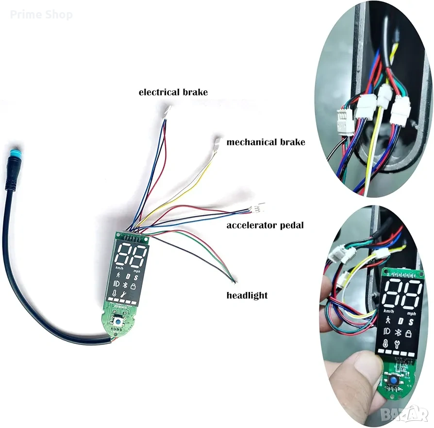 Резервното контролно табло е предназначено за електрически тротинетки от серията Xiaomi M365, M365 Pro, M365 Pro 2 и 1S. Продуктът представлява висококачествена дънна платка с метален корпус и дигитален екран, осигуряващ ясна видимост на скоростта и системните параметри в реално време. Инсталацията се осъществява чрез стандартна 4-жилна връзка, която интегрира управлението на електрическата спирачка, механичната спирачка, педала за ускорение и предния фар.