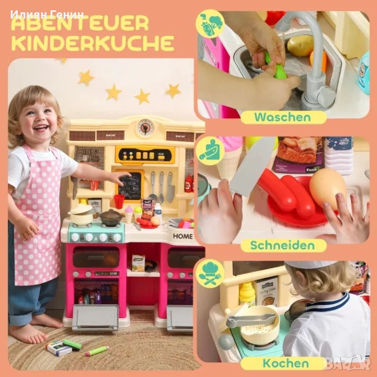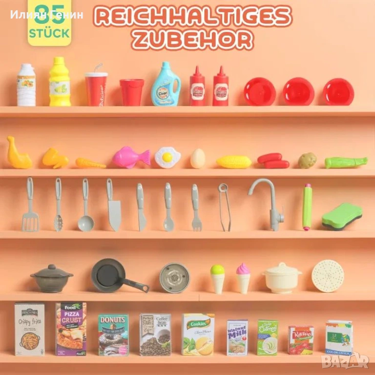 AIYAPLAY Кухня за игра с течаща вода, комплект от 85 аксесоара, електрически кран, светлини, звуци, за деца на възраст 3-6 години - 45.00 €.