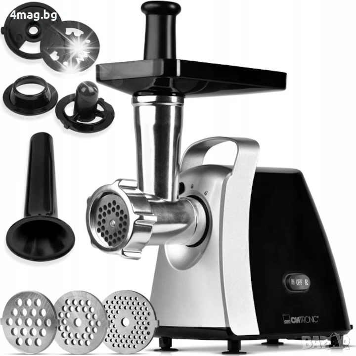 електрическа месомелачка Clatronic FW 3803. Мощност: Максимална мощност от \(1000\text{\ W}\). Функции: Разполага с функция за обратен ход (реверс) и метална предавка. Аксесоари: Комплектът включва 3 метални диска за мелене, приставка за наденици и приставка за кебе (кебапчета). Характеристики: Метална шийка, нож от неръждаема стомана и стабилна основа.