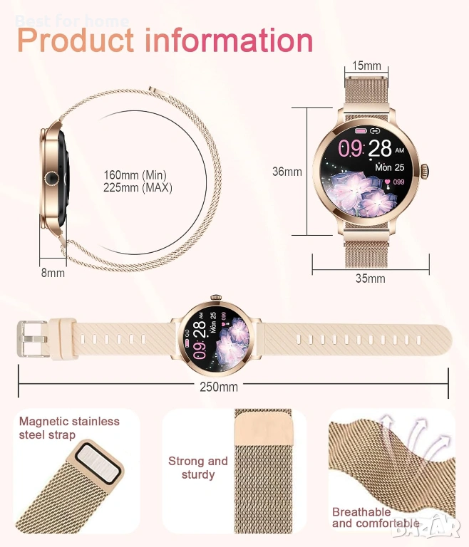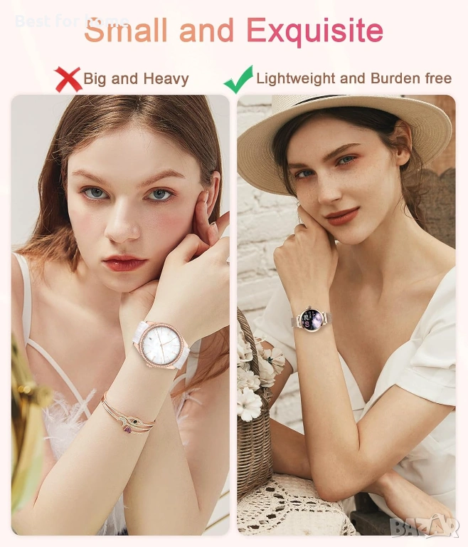 2 каишки за часовник и „Направи си сам“ циферблати: Смарт часовниците за жени са оборудвани с 2 различни каишки от неръждаема стомана и 1 силиконова каишка, което ви позволява да сменяте свободно при различни поводи. Има много персонализирани безплатни циферблати за фитнес смарт часовници, които могат да бъдат изтеглени и използвани в приложението. Освен това можете да изберете любимата си снимка или картина като тапет на часовника.
