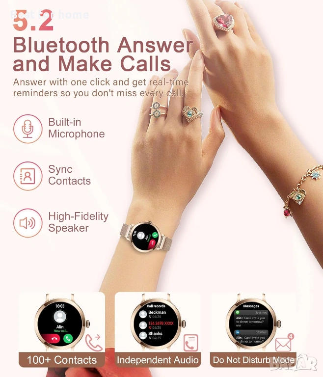 Напомняне за повиквания и съобщения чрез Bluetooth: умните часовници niolina за жени имат вградени високоговорители и микрофони с висока разделителна способност. След свързване чрез Bluetooth можете директно да използвате умния часовник, за да отговаряте или осъществявате повиквания, да добавяте контакти и да преглеждате последните записи на повиквания. Можете също така да получавате съобщения на умния часовник от различни социални платформи. Никога не пропускайте повикване или съобщение по време на тренировка или бягане.