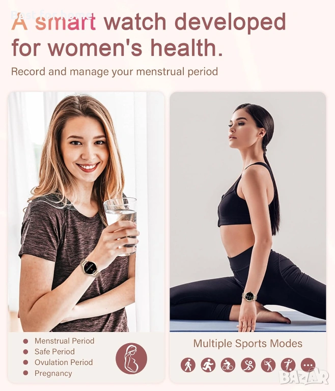 Целодневен здравен монитор: Смарт часовниците за жени разполагат с усъвършенствани сензори, които ви помагат да отчитате сърдечната честота, кръвното налягане и кислорода в кръвта в реално време през целия ден. Те автоматично следят състоянието на съня ви и предоставят цялостен анализ на качеството на съня, като го синхронизират с приложението. Можете да получите повече здравни подробности чрез "FitCloudPro". Смарт часовникът за жени може също да записва менструалния цикъл на жената за внимателно управление на менструалния цикъл.