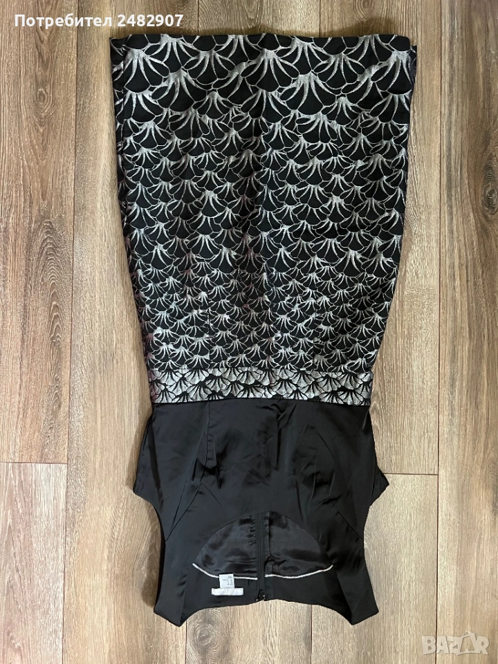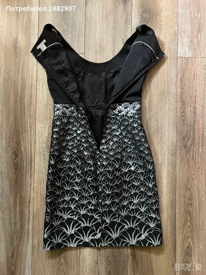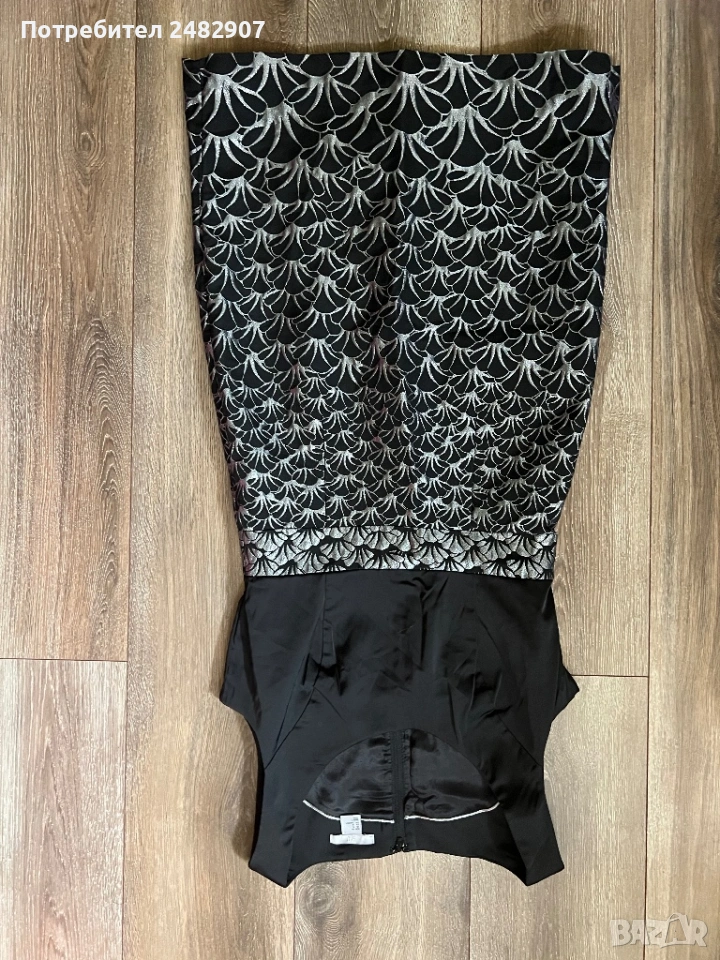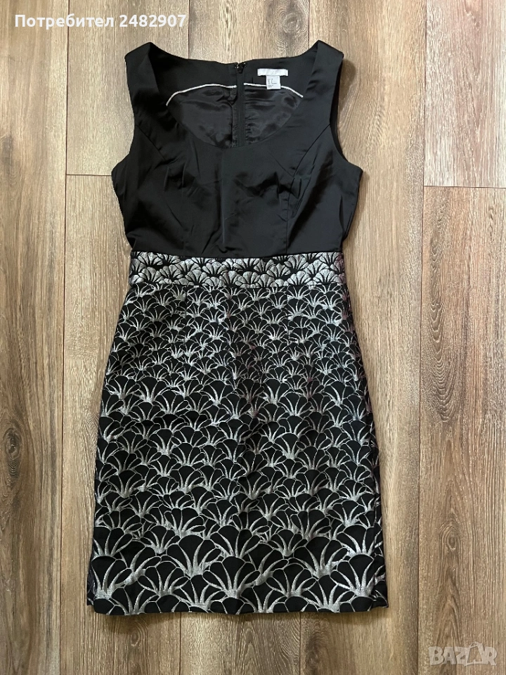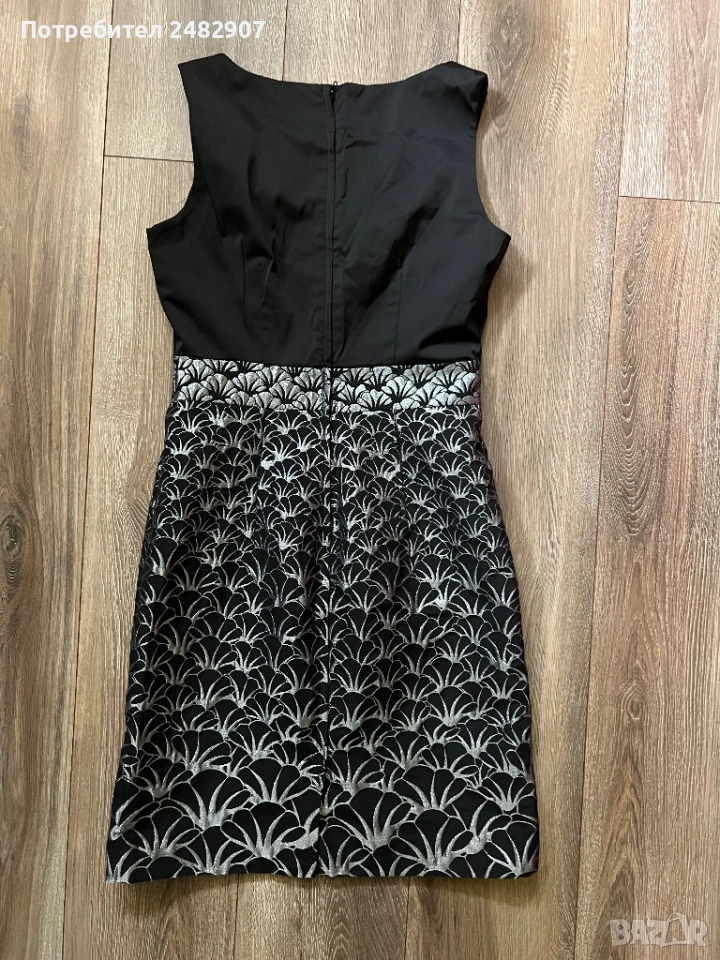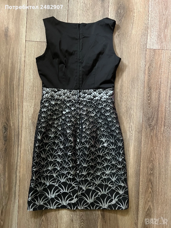 Красива дамска рокля в черно и сребристо с блестящ ефект, размер 38. Съдържа 61 % полиестер, 36 % памук и 3 % еластан. Ширина в раменете - 35 см, ширина под мишниците - 43 см, ширина в талията - 36 см, ширина в долната част - 47 см, дължина от рамото до долу - 92 см. Много запазена, обличана веднъж за повод, с подплата и цепка отзад и закопчаване - с дълъг цип отзад (50 см), без забележки, неразличима от нова.