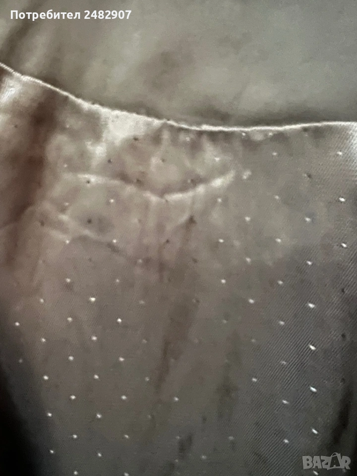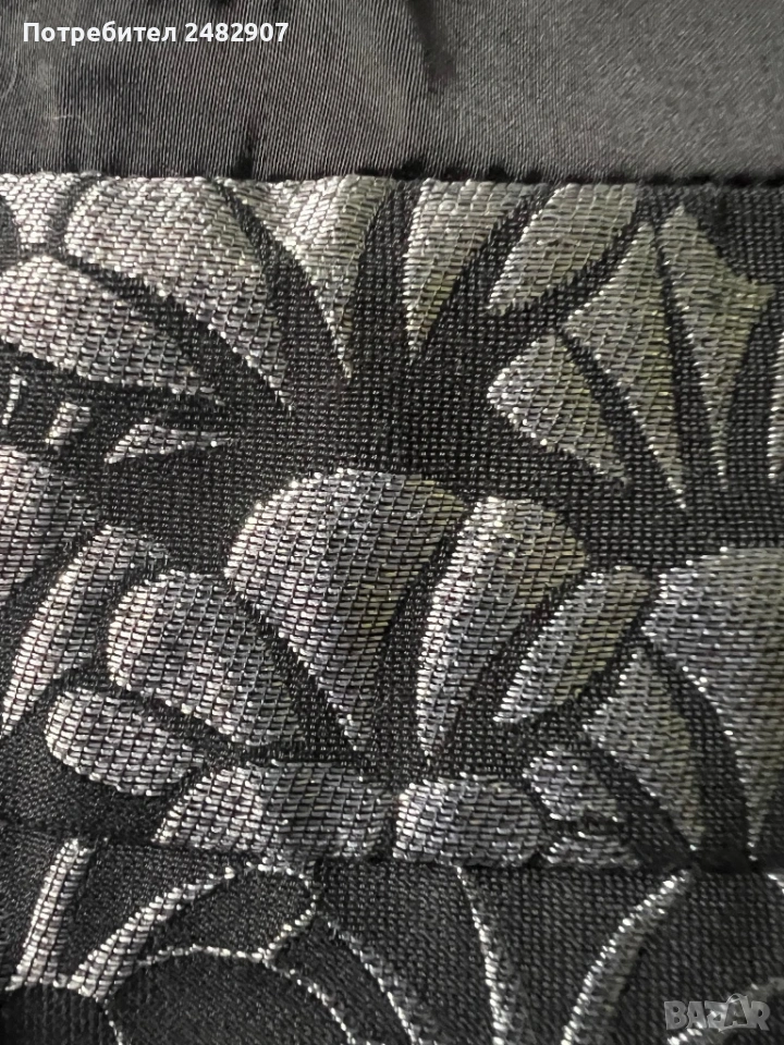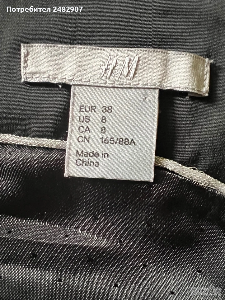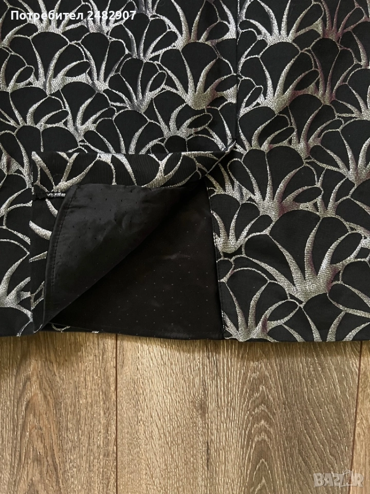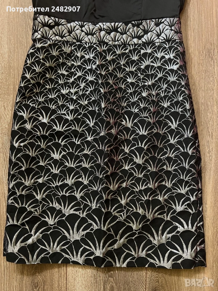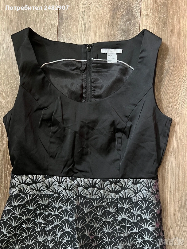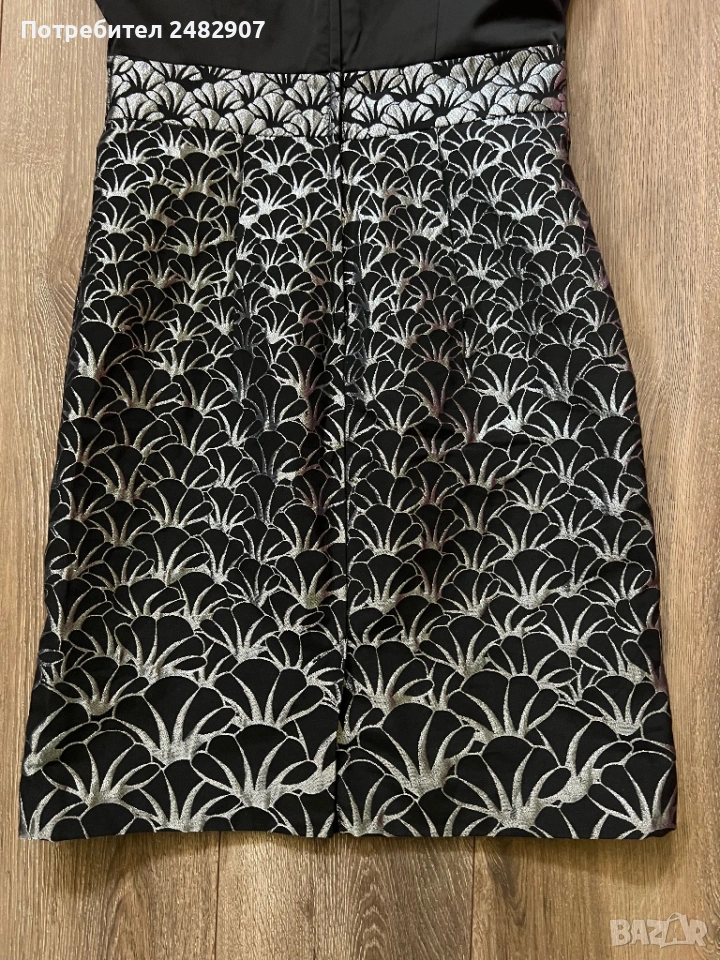 Красива дамска рокля в черно и сребристо с блестящ ефект, размер 38. Съдържа 61 % полиестер, 36 % памук и 3 % еластан. Ширина в раменете - 35 см, ширина под мишниците - 43 см, ширина в талията - 36 см, ширина в долната част - 47 см, дължина от рамото до долу - 92 см. Много запазена, обличана веднъж за повод, с подплата и цепка отзад и закопчаване - с дълъг цип отзад (50 см), без забележки, неразличима от нова.