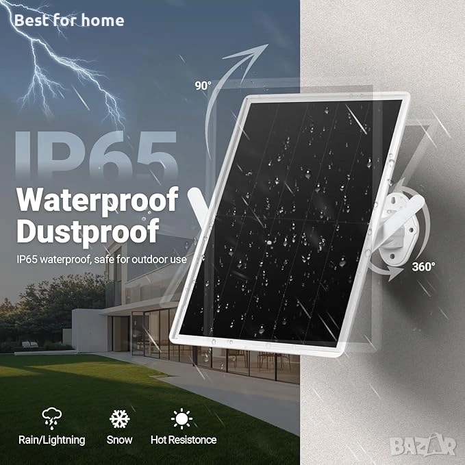 【Устойчивост при всякакви метеорологични условия】:Водоустойчивият слънчев панел с клас на защита IP65 осигурява надеждна употреба на открито, дори при силен дъжд или сняг. Работи при температури от -5°F до 120°F, гарантирайки непрекъснато захранване на камерата при всякакви метеорологични условия.