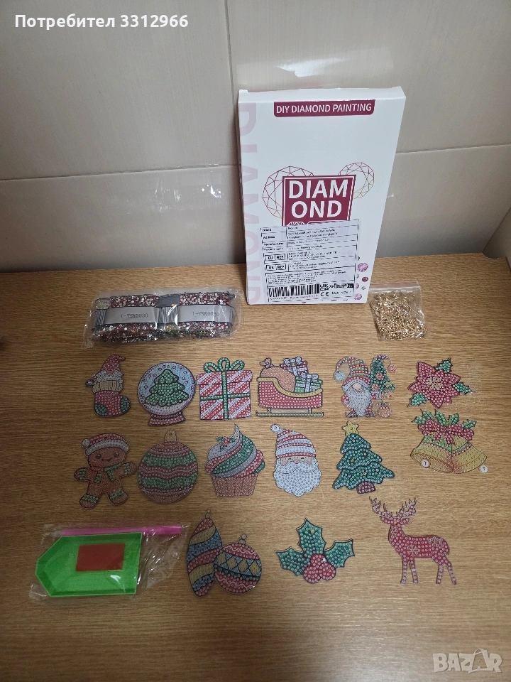 комплект за диамантен гоблен "Направи си сам" с коледна тематика. Съдържание: Включва тематични коледни фигури за декориране с малки цветни кристали (мъниста), инструменти за поставяне и верижки. Употреба: Фигурите могат да се използват като стикери или висулки за декорация.