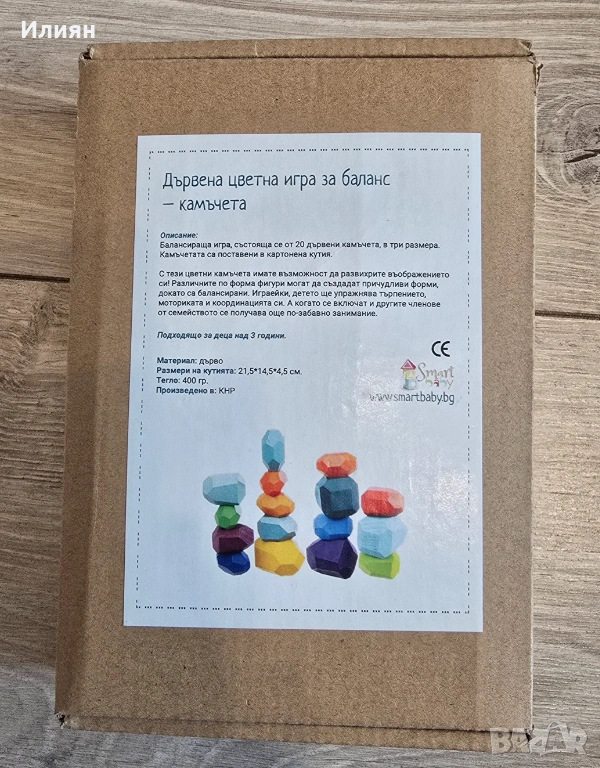 Балансираща игра, състояща се от 11 дървени камъчета, в три размера. Камъчетата са поставени в картонена кутия.