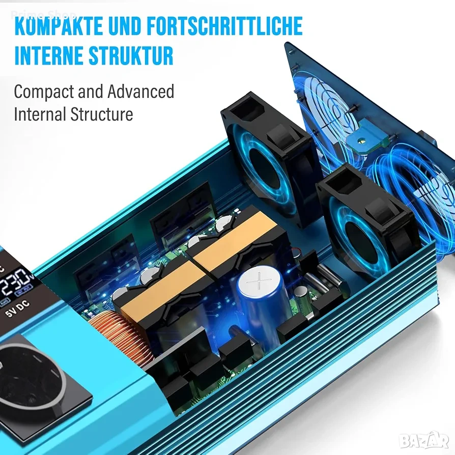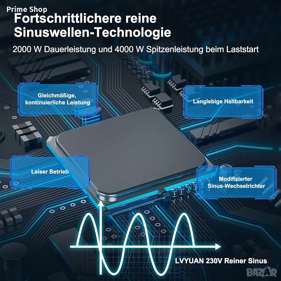 Този продукт представлява висококачествен инвертор с пълна (чиста) синусоида, предназначен за преобразуване на постоянен ток (24V DC) в променлив ток (230V AC). Устройството осигурява стабилно и надеждно захранване с номинална мощност от 2000W и пикова мощност до 4000W, което го прави изключително подходящо за използване в камиони, кемпери и при аварийни ситуации за захранване на чувствителна електроника. Здравият алуминиев корпус гарантира ефективно отвеждане на топлината, а усъвършенстваната схема с изолиран вход и изход предпазва свързаните устройства.