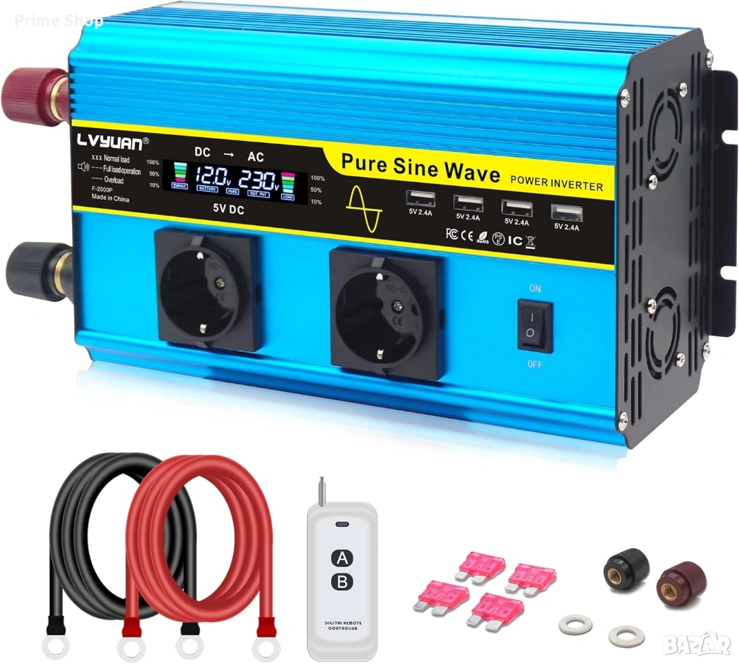 2000W/ 4000W инвертор чиста синусоида, 24V - 230V с дистанционно и кабели