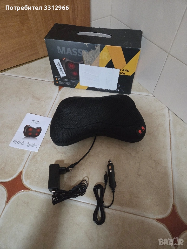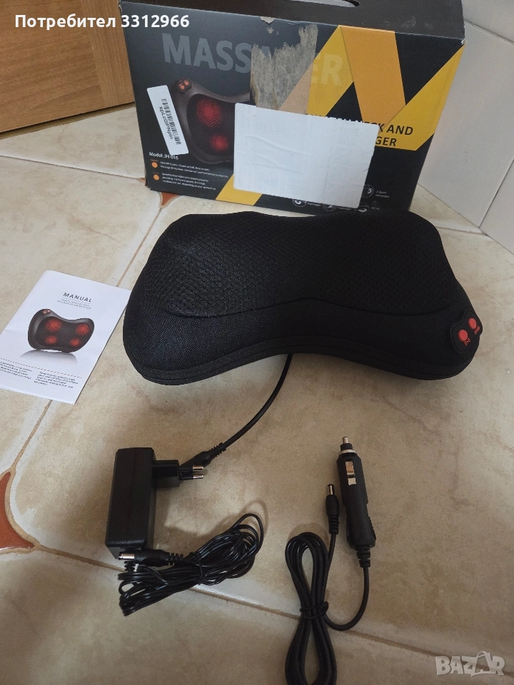 Чисто нова Шиацу масажна възглавница, предназначена за отпускане на мускулите на гърба, врата и раменете. Функции: Разполага с въртящи се масажни глави и функция за инфрачервено нагряване за по-дълбок масаж. Употреба: Дизайнът е ергономичен, което я прави подходяща за различни части на тялото. Захранване: Комплектът включва адаптер за домашна употреба и адаптер за кола.