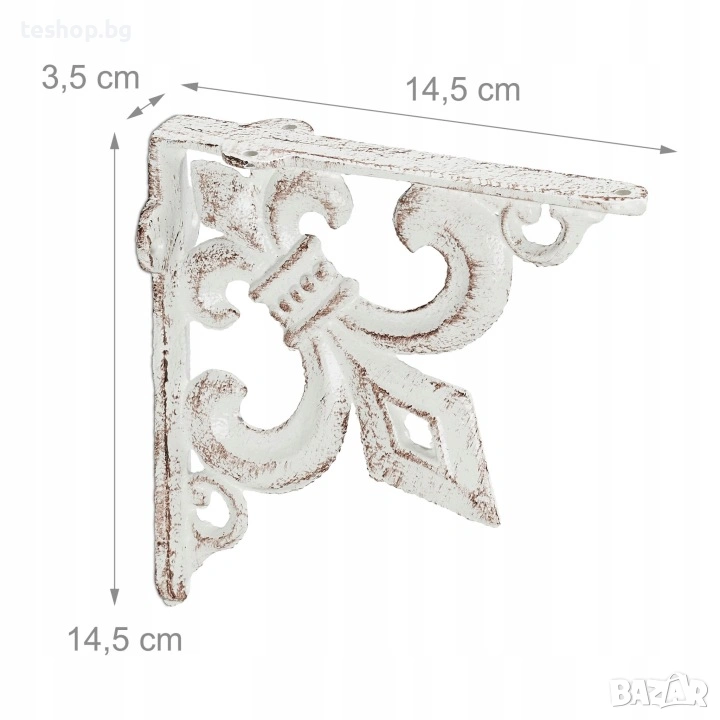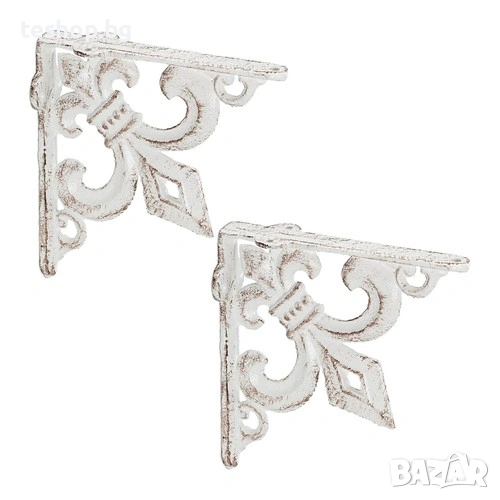 Трансформирайте интериора си с тези ъглови скоби за рафтове в античен стил. Една обикновена дъска е всичко, от което се нуждаете, за да създадете уникален рафт, който красиво показва книги, растения или орнаменти. Рустичният чугун с мотивите на лилии е привличащ вниманието и перфектно допълва винтидж, шаби шик или кънтри декор.