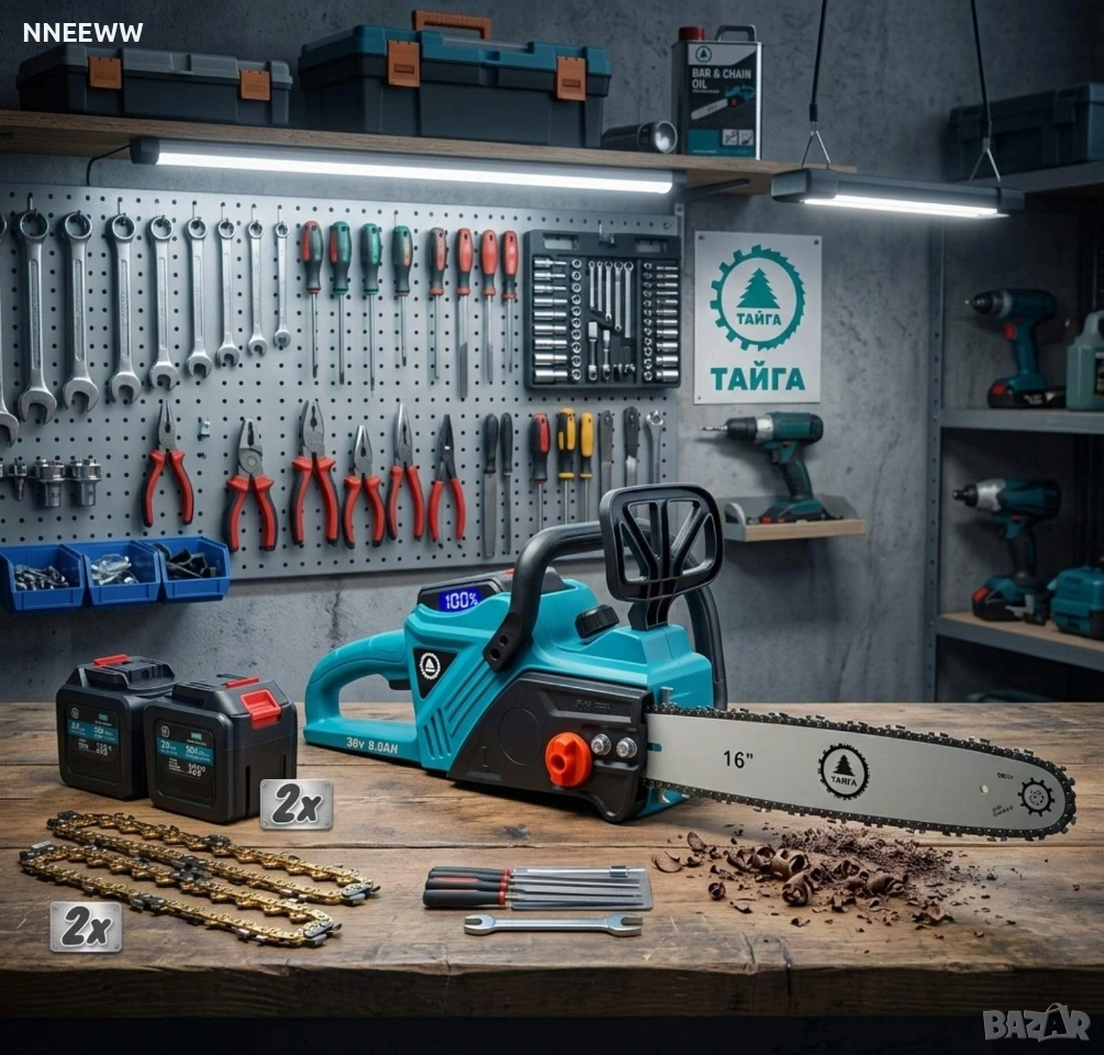 Продуктът е предназначен за работа на открито, дърводобив и поддръжка на горски масиви, като предлага мобилност без нужда от кабели или бензинови смеси Захранване: Системата работи с две литиево-йонни батерии, всяка с капацитет от 8.0\text{Ah} и напрежение 36\text{V}. Режеща част: Оборудвана е с 16-инчова (16") шина и верига, подходящи за рязане на средни по размер дървени трупи. Дисплей: Машината разполага с вграден дигитален LED дисплей в горната част, който показва процента на оставащия заряд (в случая 100%). Окомплектовка и дизайн Зарядна станция: В комплекта е включено двойно настолно зарядно устройство (Pro Charging Station), позволяващо едновременно зареждане на двете батерии. Ергономичност: Дизайнът включва преден предпазител (спирачка), ергономична дръжка за захват и видим механизъм за обтягане или фиксиране на шината в оранжев цвят. Цветова схема: Инструментът е изпълнен в разпознаваем тюркоазено син цвят с черни и оранжеви акценти.