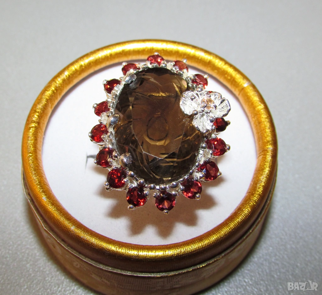 925 серъбен пръстен с 36 карата опушен кварц, 23x15мм. Тегло на пръстена 16.4гр. Другите камъни са гранат. Произход Африка. Халка 8/57. Цена 120 евро.
