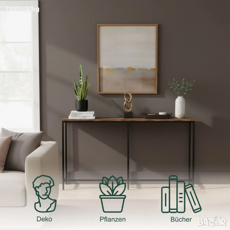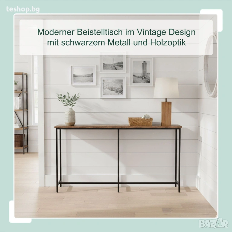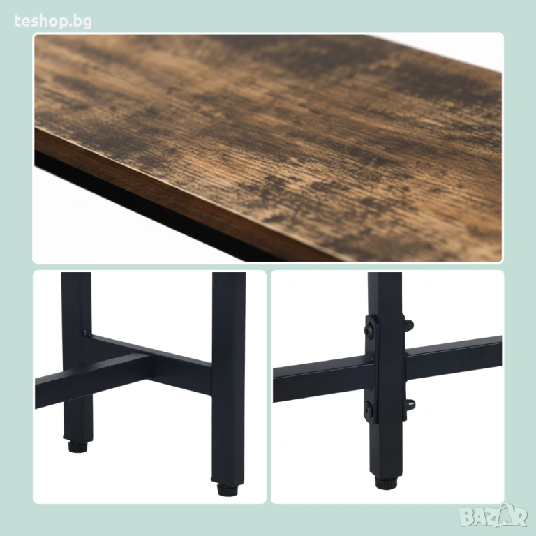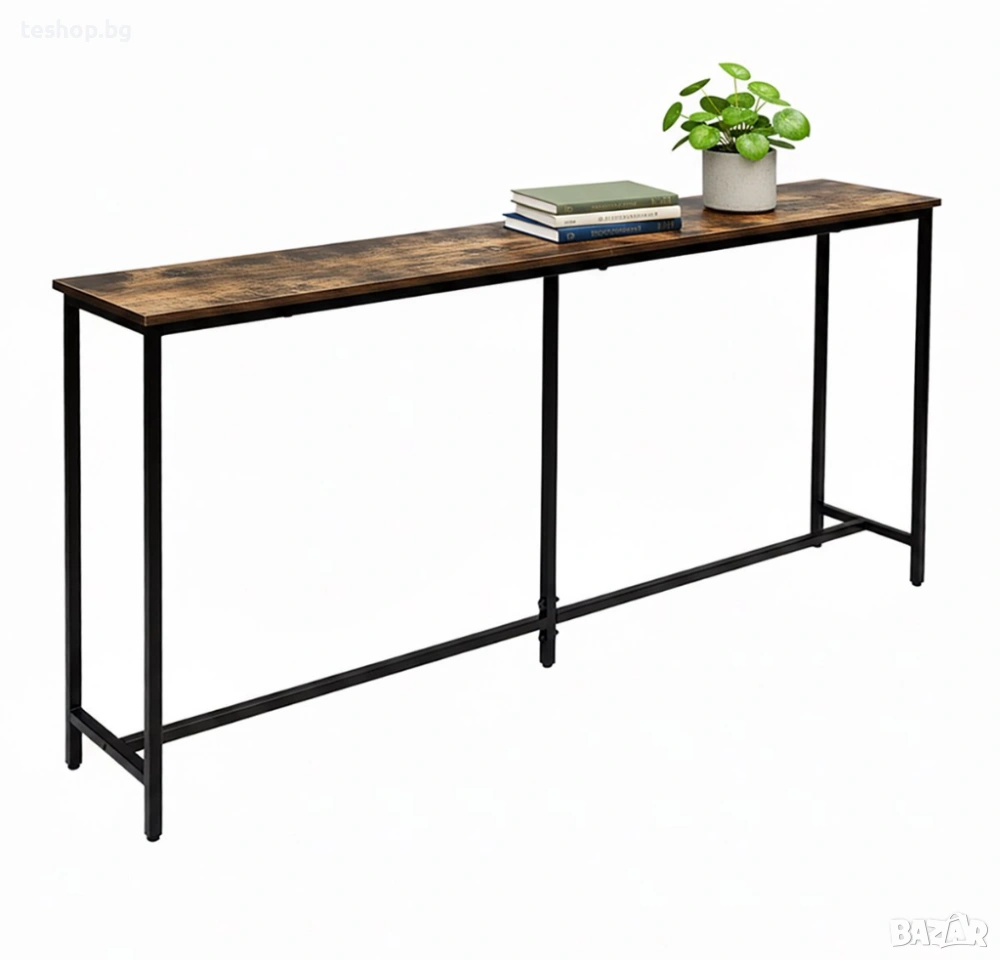 Независимо дали я използвате като странична масичка в коридора за ключовете и телефона си или като конзолна масичка зад дивана в хола, тази маса е подходяща за всяко място. Черната метална рамка, комбинирана с кафяви дъски с дървесен вид, придава на масата индустриален характер. Конзолната маса е с дълбочина 20 см и ширина 160 см, което я прави идеална за тесни, дълги коридори. Регулируемите крачета осигуряват стабилност дори на неравни подове.