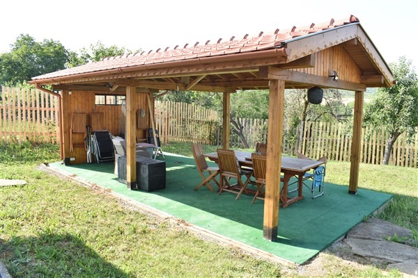 Имотът е разположен върху просторен парцел от 930 квадратни метра, който е изцяло ограден с ограда. Задната градина разполага с покрита беседка, свързана с електричеството и обзаведена с голяма външна маса за хранене и столове. Оттук се открива чудесна гледка към селото, околните хълмове и лозя, създавайки спокойна обстановка за релакс на открито.