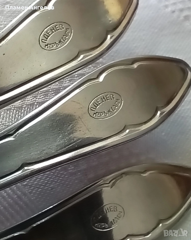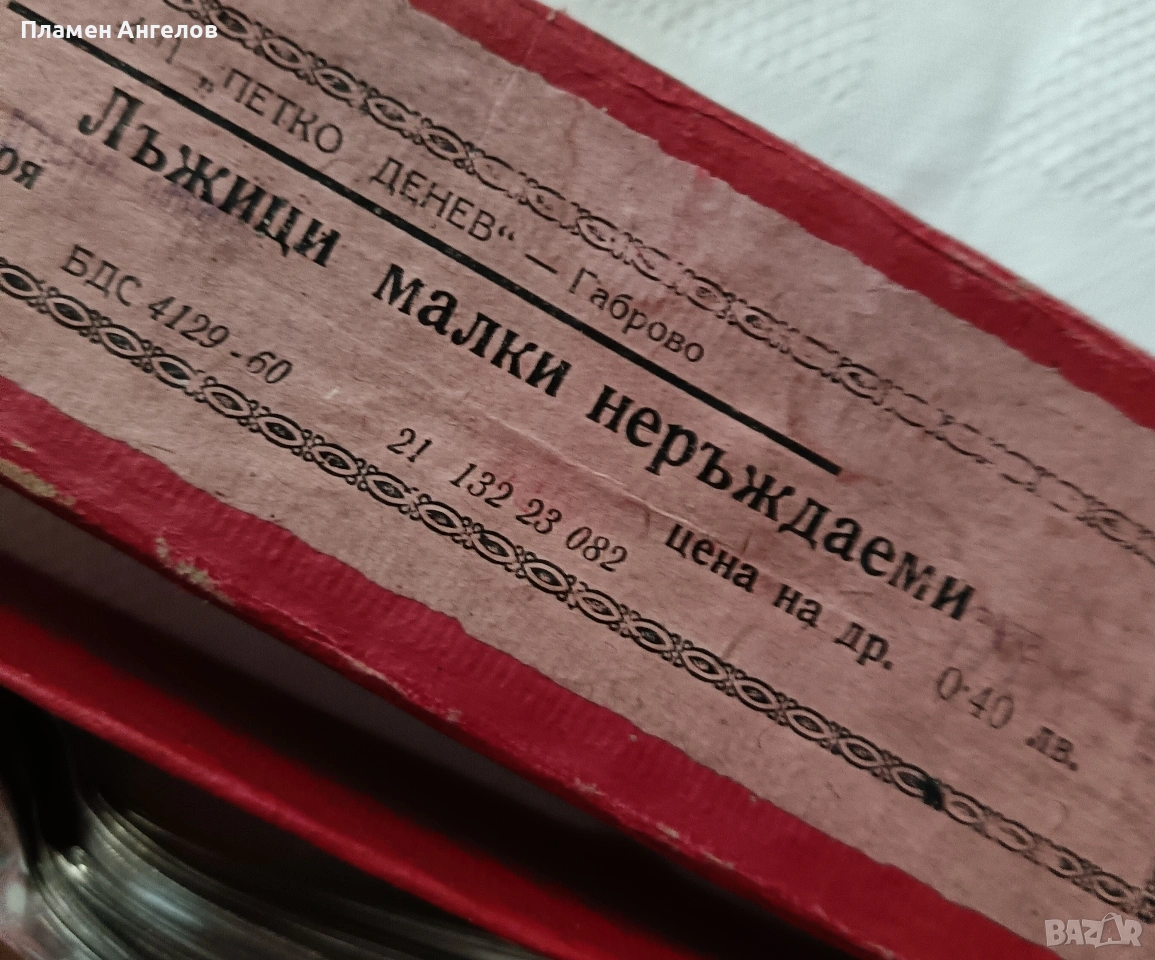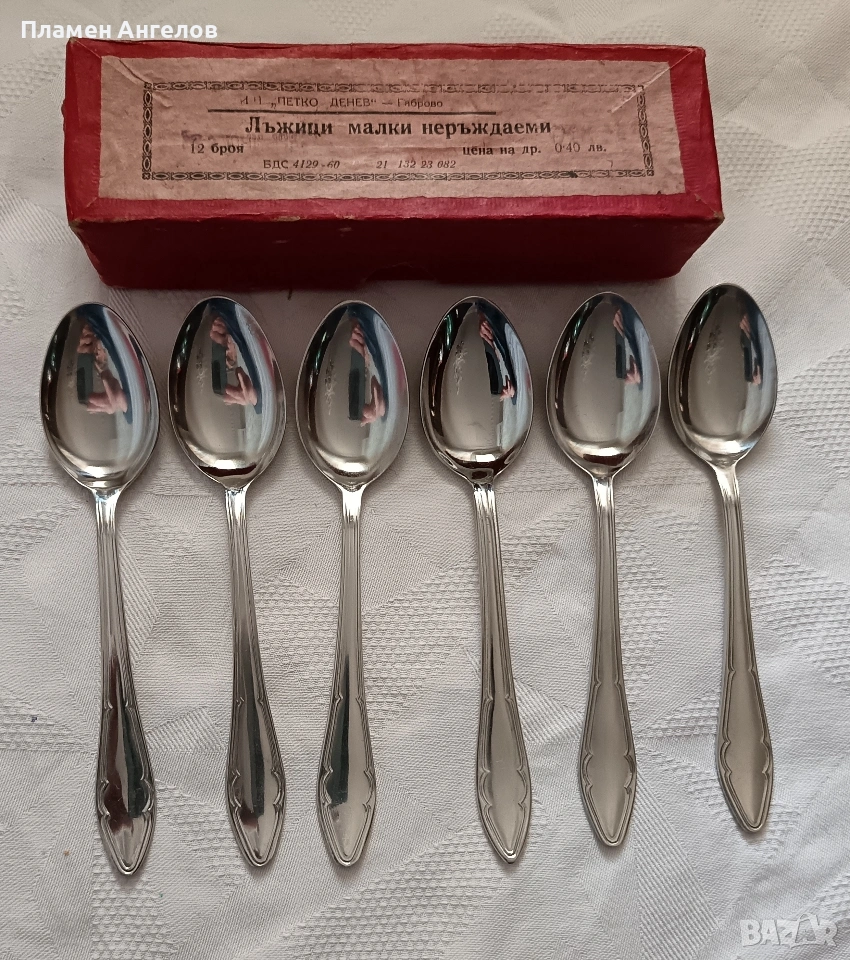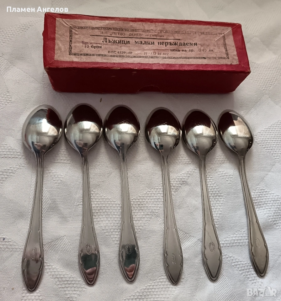 Комплект от 6 десертни лъжички. Старото производство, класически модел на завода "Петко Денев" в Габрово. Чисто нови, неупотребявани, неизползвани в оригиналната си опаковка. В отлично състояние, от висококачествена неръждаема стомана. Не потъмняват със годините. В перфектно състояние.