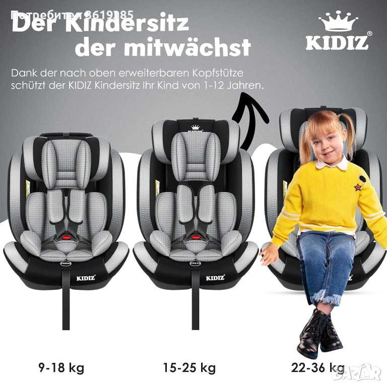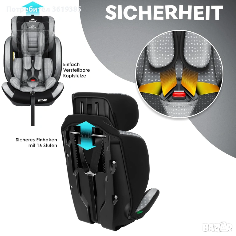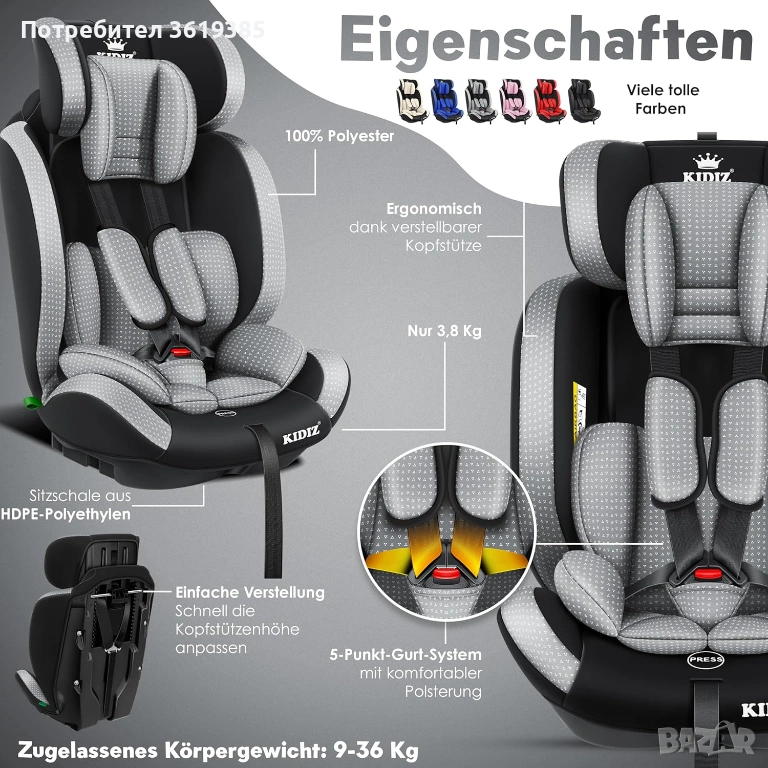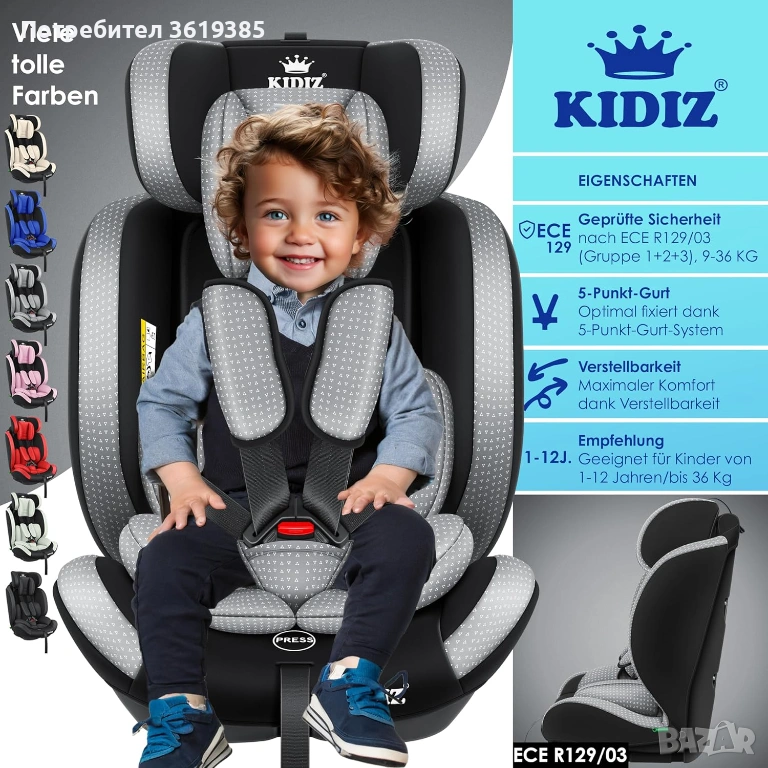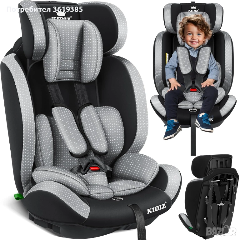 Висококачествено столче за кола Kidiz за деца на възраст 1-12 години.