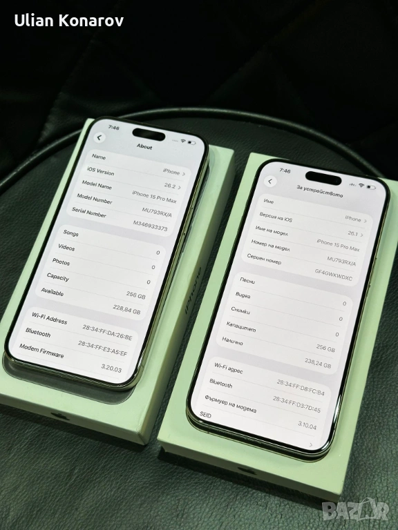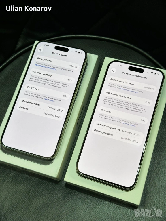 Телефонът е неразличим от нов. А другия има леки финни следи от употреба по дисплея. Козметично. Продава се с кабел за зареждане. Телефонът е с памет 256гб и батерия на 88%.