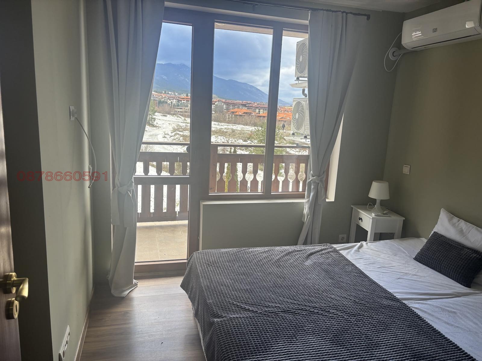 Продаваме на ПРОМО ЦЕНА 75 000 евро едноспален апартамент в гр. Банско. Изцяло ново и модерно обзаведен с нов ламинат, климатици, голям смарт тв. Апартаментът се състои от: всекидневна с кухненски бокс (трапезарна маса, 4 трапезарни стола, разтегателен диван тройка, хладилник, работно бюро за един човек, смарт тв 65 инча, климатик, кухненски бокс с печка, котлон, абсорбатор, микровълнова фурна, изход към тераса), спалня (тапицирано легло 160 см. с място за съхранение, висококачествен матрак, голям гардероб, две нощни шкафчета, осветително тяло с голям таванен вентилатор, климатик, изход към тераса), баня с тоалетна, тераса. Апартаментът се намира в комплекс със спа зона, басейн, двор ресторант, лоби, рецепция, конферентна зала. Телефон за връзка: 00359 895 750 880