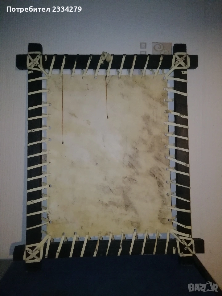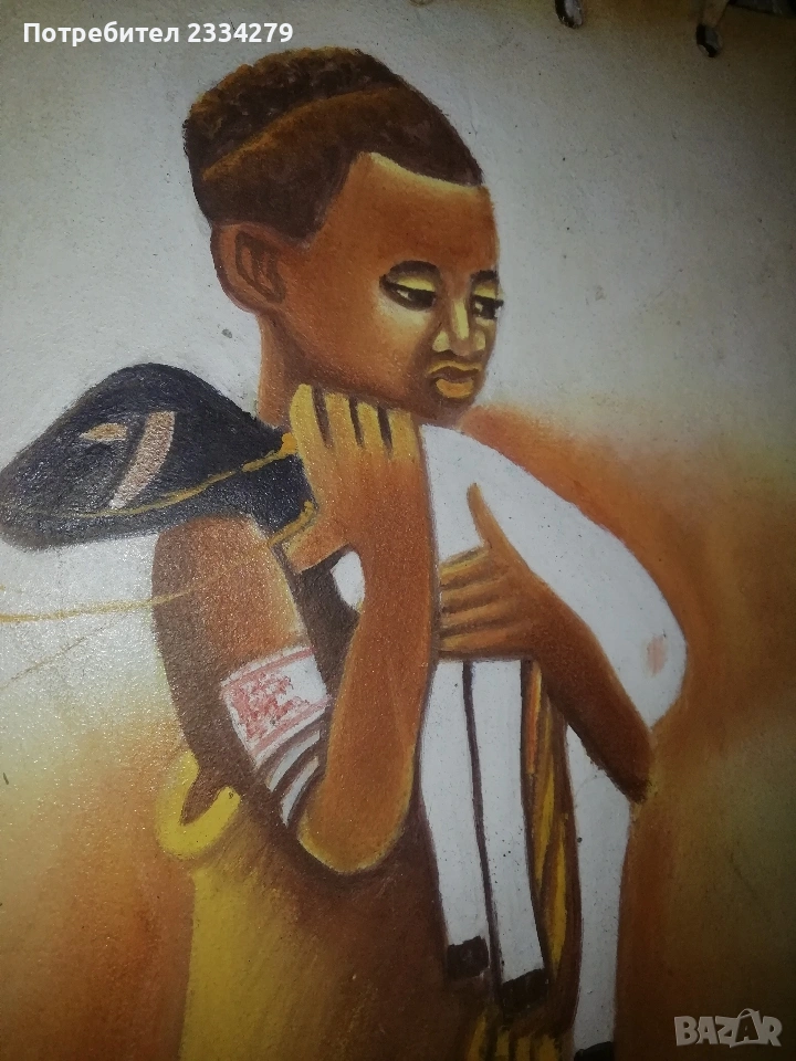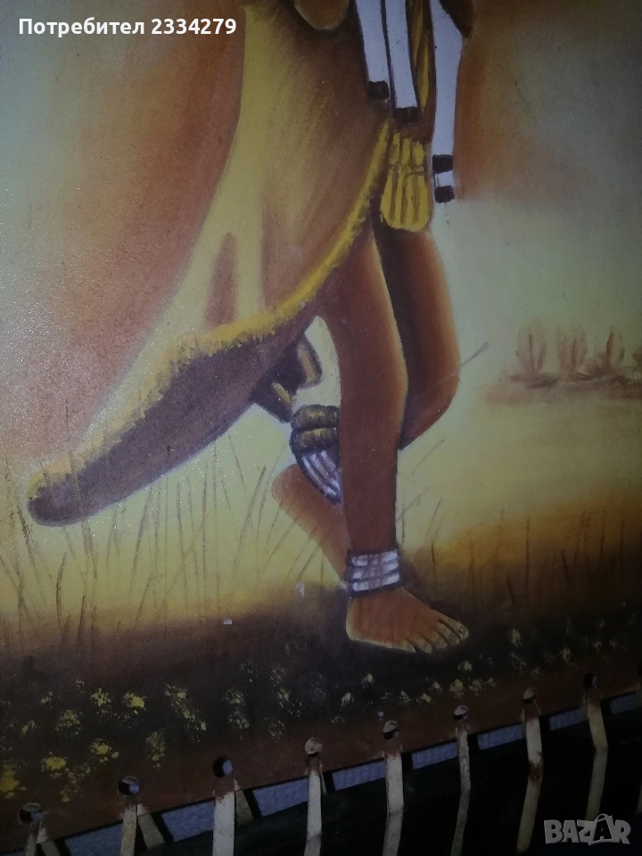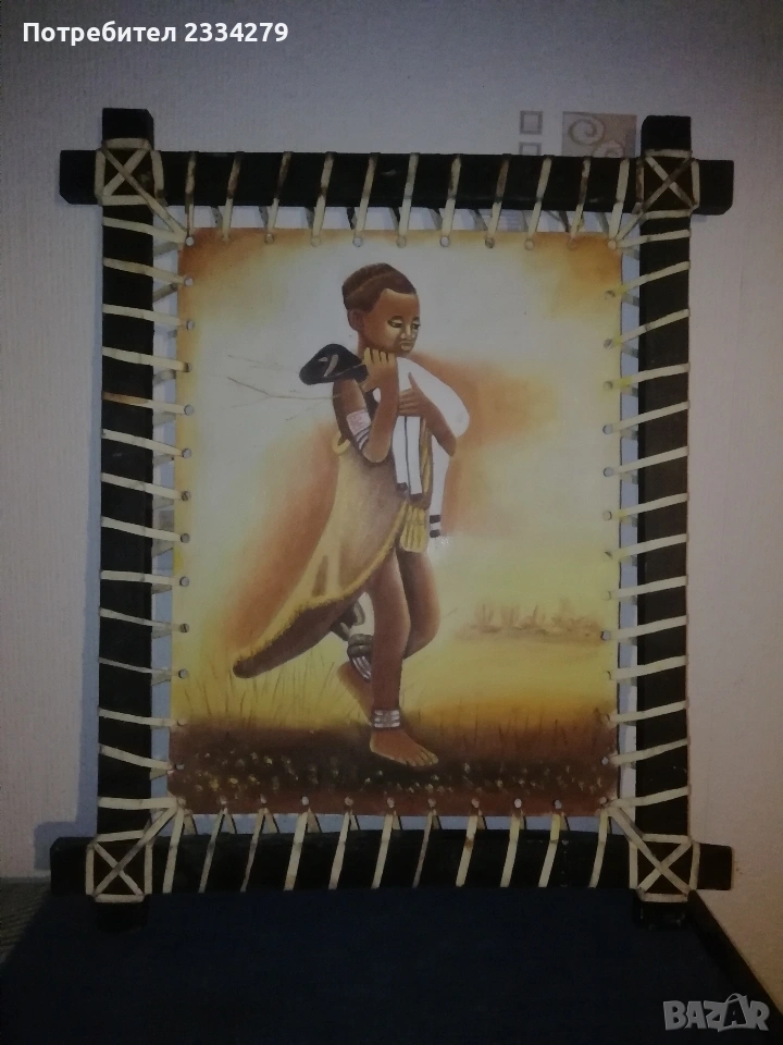 Стар гоблен и картина върху кожа. N:1 немски гоблен ръчно избродирана с кръста бод, базиран по картината на немският художник Карл Швицвег ,,Пощальонът в Розентал", поставен в дървена рамка с размери 60х48см., цена 40€.; N:2 оригинална африканска маслена картина, живопис изобразяващ ,,Африканско дете с агне", творбата е нарисувана върху кожа с маслени бои и разпъната на дървена рамка с размери 60х47см., метод за Етиопско и общо африканско изкуство, цена 20€.