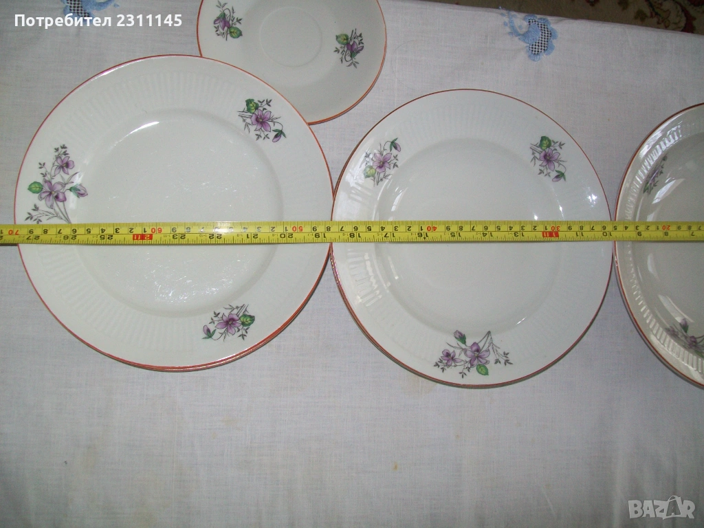 - Чинии. Български порцелан. С еднаква шарка, различна големина. 2 плитки, диаметър 22см.; 2 дълбоки 4 см, диаметър 23см; 1 дълбока 5 см, диаметър 25см. и 1 малка 15см. Цена 15€