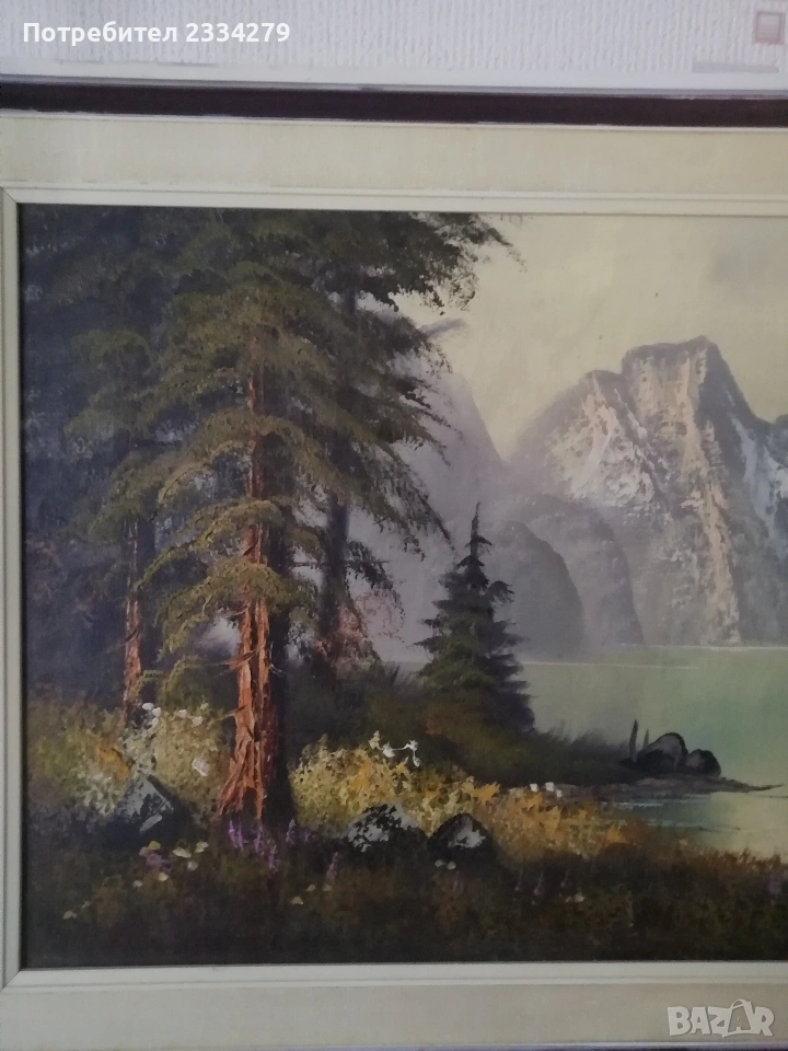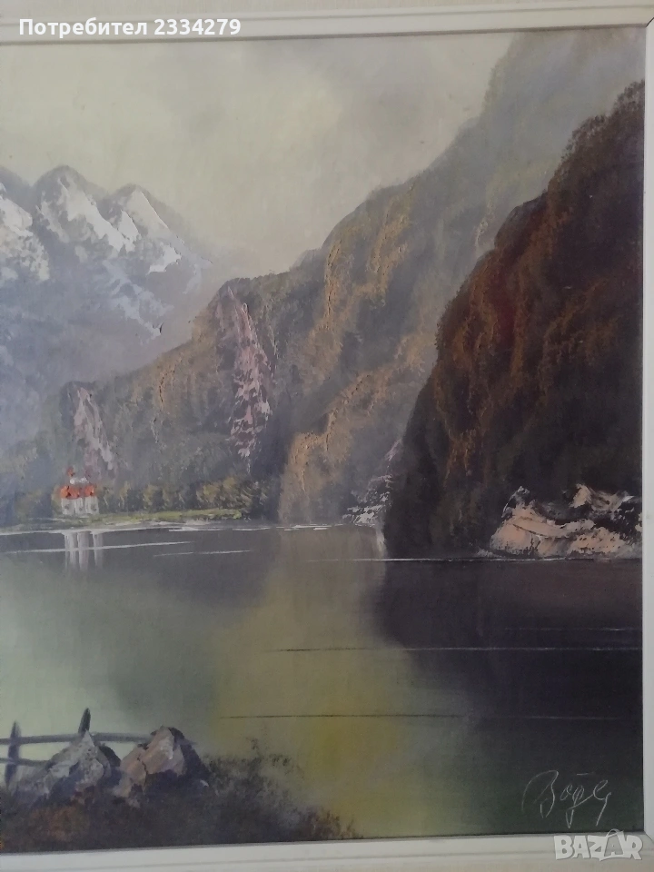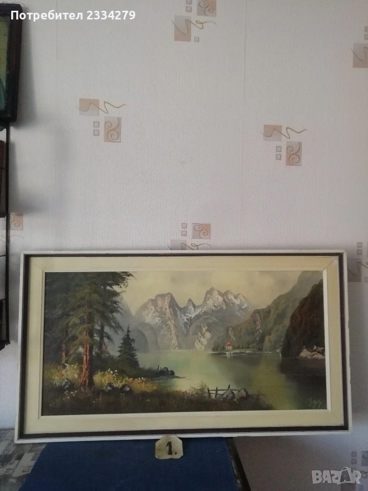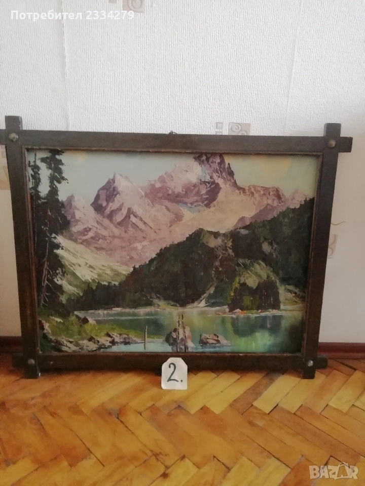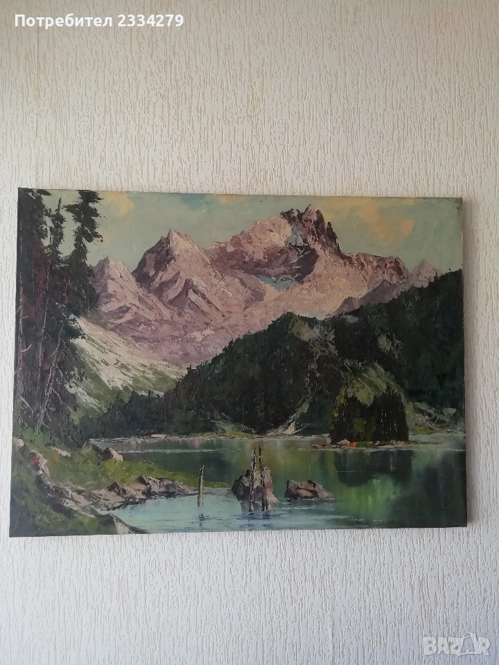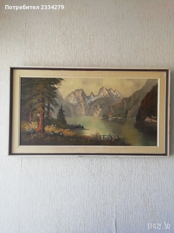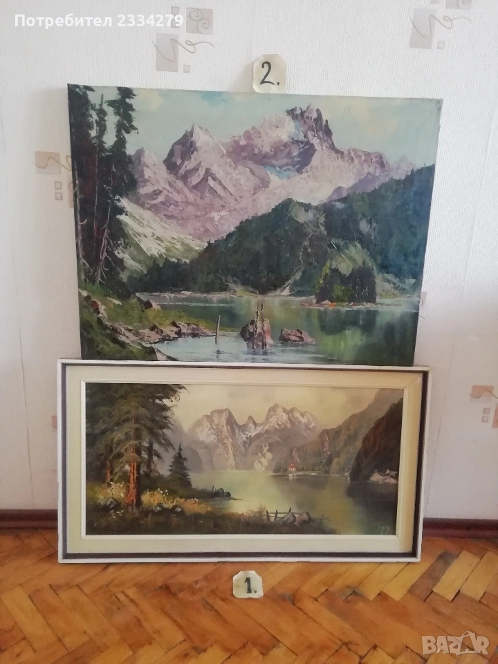 Стяари картини ръчно рисувани от различни автори в различни години, изобразяващи емблематичният алпийски пейзаж на езерото ,,Кьонигзес" в Бавария с изглед към величествения връх Вецман (кътчето на художниците). N:1 авторска ръчно рисувана картина на художника Карл Бьогле има автограф, а отзад дата 4.12.1978год. и надпис от автора, картината е класически реализъм изпълнен с маслени бои, платно поставено в двустепенна дървена рамка с размери 90х50см., цена 70€.; N:2 ръчно рисувана авторска картина, класически реализъм, авторски живопис, изпълнение маслени бои на платно, ХХ век на художника Wtuger, има и автограф, размери 80х60см. (към платното има и дървена рамка в алпийски стил, цена €.