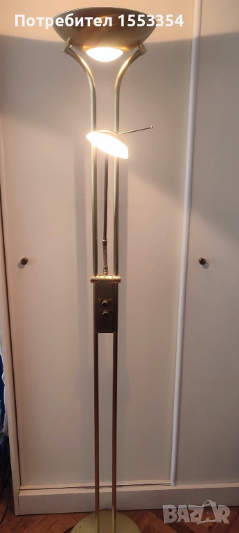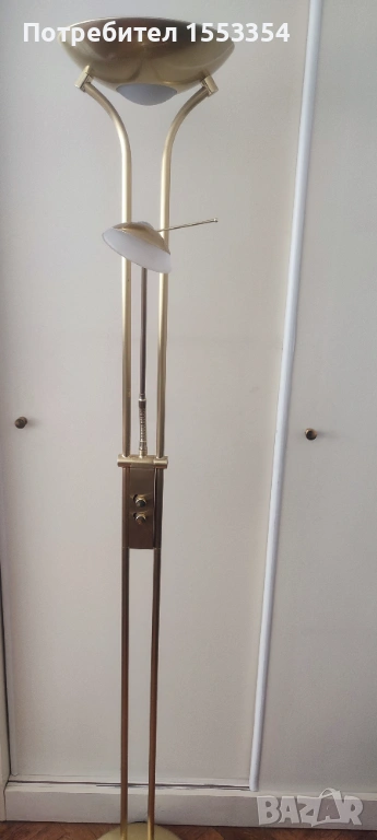Лампион за под, златист цвят, димируем, с леки следи от употреба. Височина 182 см.