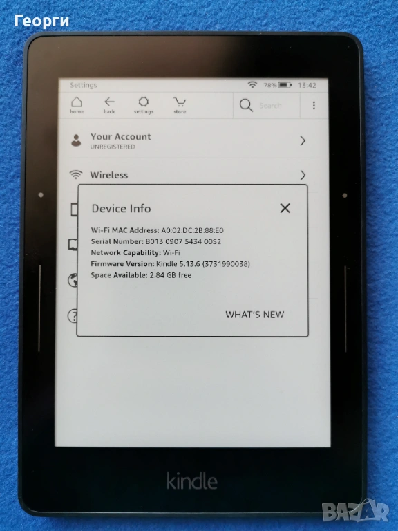 Може да си регистрира в Амазон, книги могат да се качват както през вградения браузър така и с кабел през компютър. Може и да се пращат по имейл(send to Kindle) след регистрация .