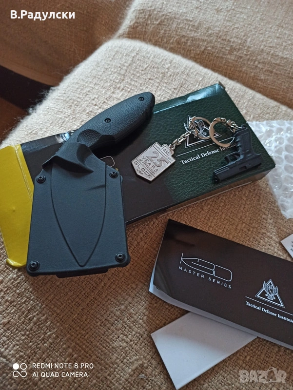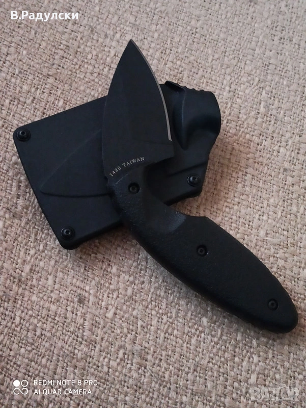 In extreme close quarters encounters where a suspect is attempting to take an officer's handgun, or an officer cannot access his handgun, the TDI knife is available as a "last option" knife. When worn on the pant belt the entire unit - knife and sheath - is well concealed. Designed by John Benner, founder and owner of Tactical Defense Institute. This knife has a black coated blade and black handle. The sheath is specifically designed to fit police officer's pant belt (4.25 cm) on the opposite side of firearm.