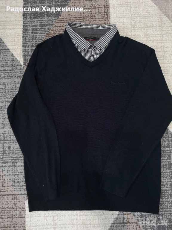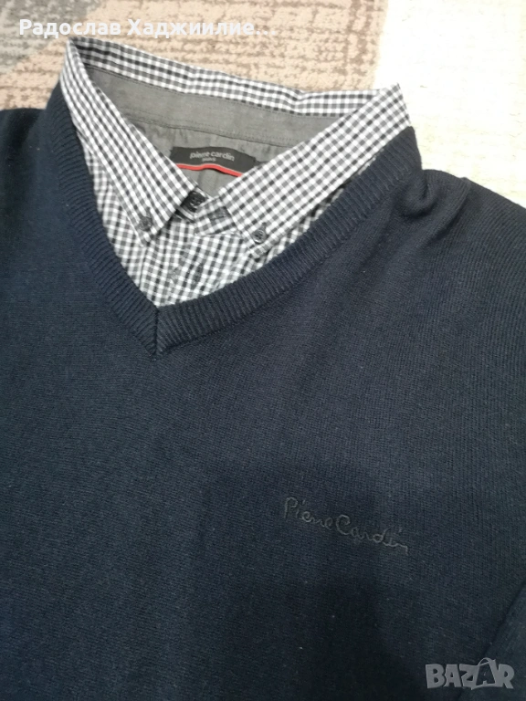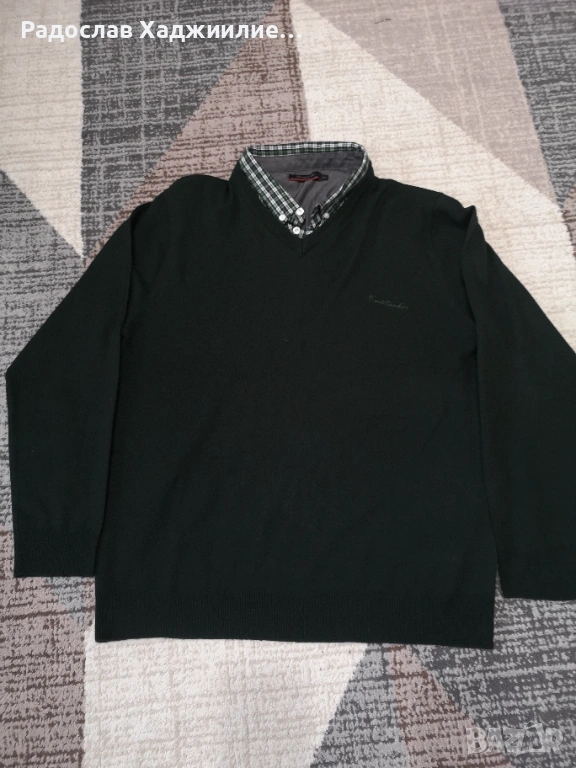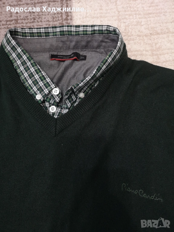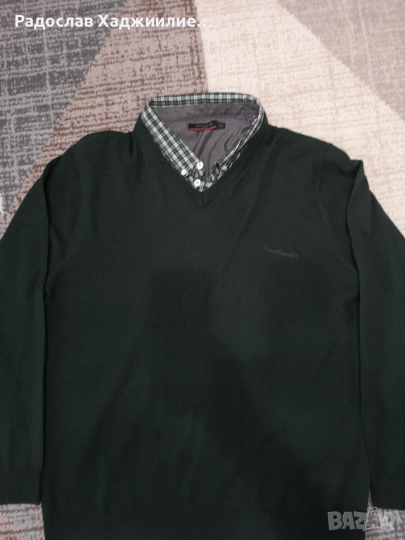 Pierre Cardin блузи. Продавам 2 изключително запазени блузи с имитираща яка. Размера на етикета е 2XL, по принцип отговарят на XL. Едната е чисто черна, другата тъмно зелена. Няма абсолютно никакви следи от употреба, понежа са носени много малко време. Цена за двете 17.99 евро (35.19 лв). Само едната мога да я продам за 10 евро (19.96 лв). Имам още много запазени дрехи размер XL, продавам ги поради загуба на тегло.