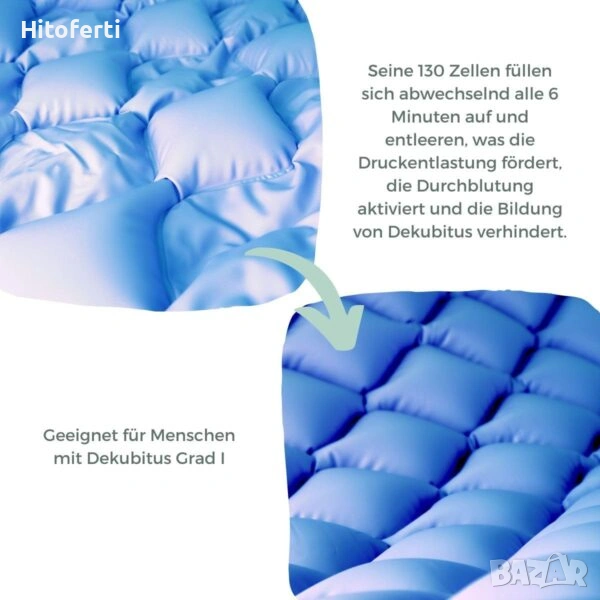 - ✔️ Терапевтичен ефект: този матрак помага за облекчаване на болката на пациента и намаляване на напрежението, причинено от дълго лежане, подобрява кръвообращението и спомага за намаляване на триенето със самонадуването на въздушния матрак и намалява появата на рани от залежаване, благодарение на 130 отделни въздушни клетки, които се надуват и изпускат последователно на интервали от шест минути