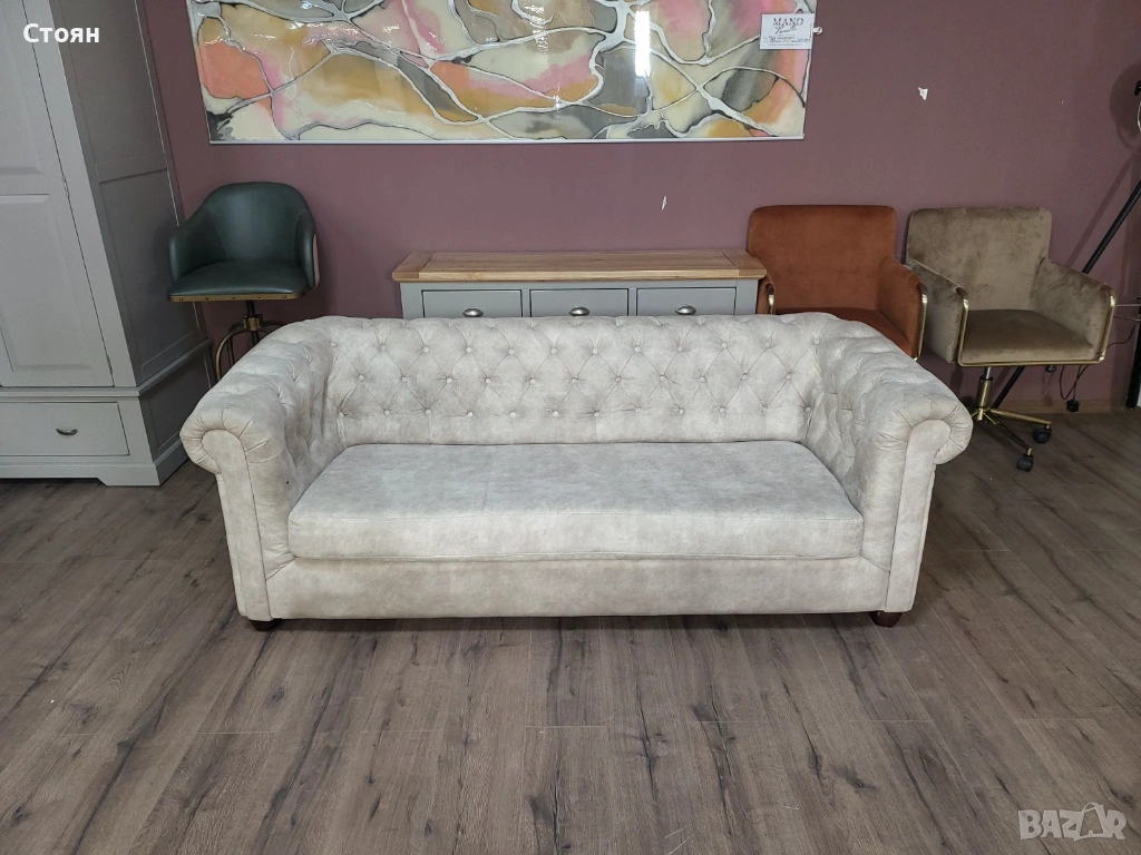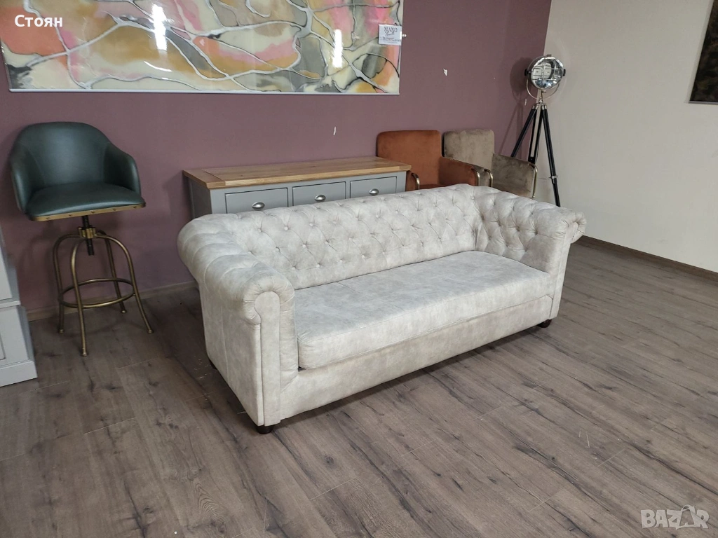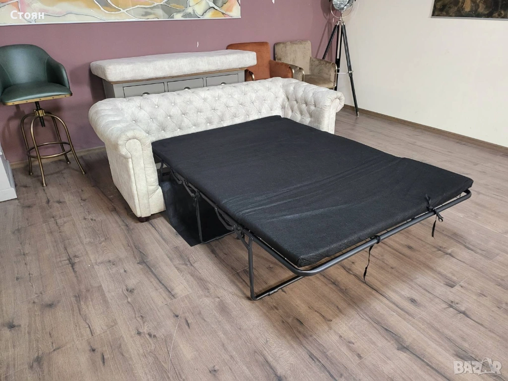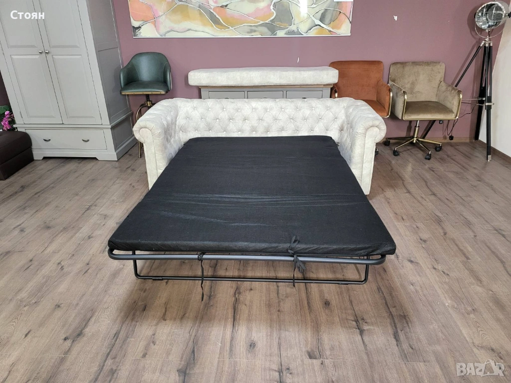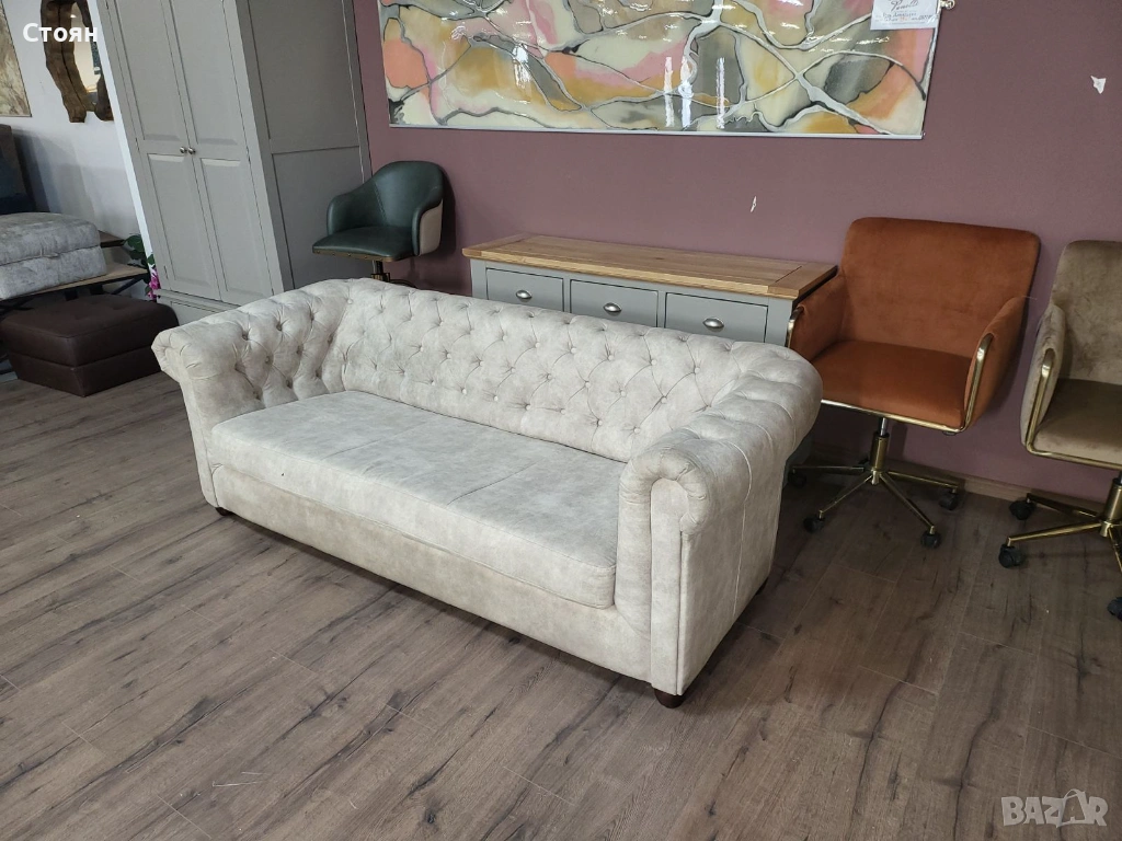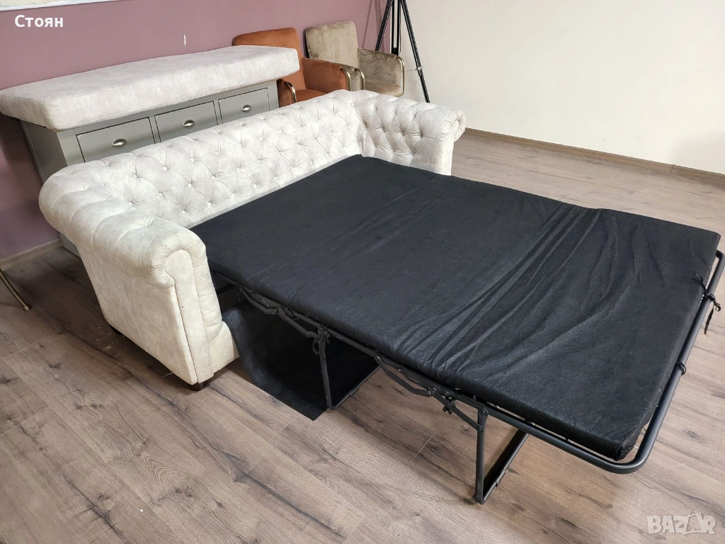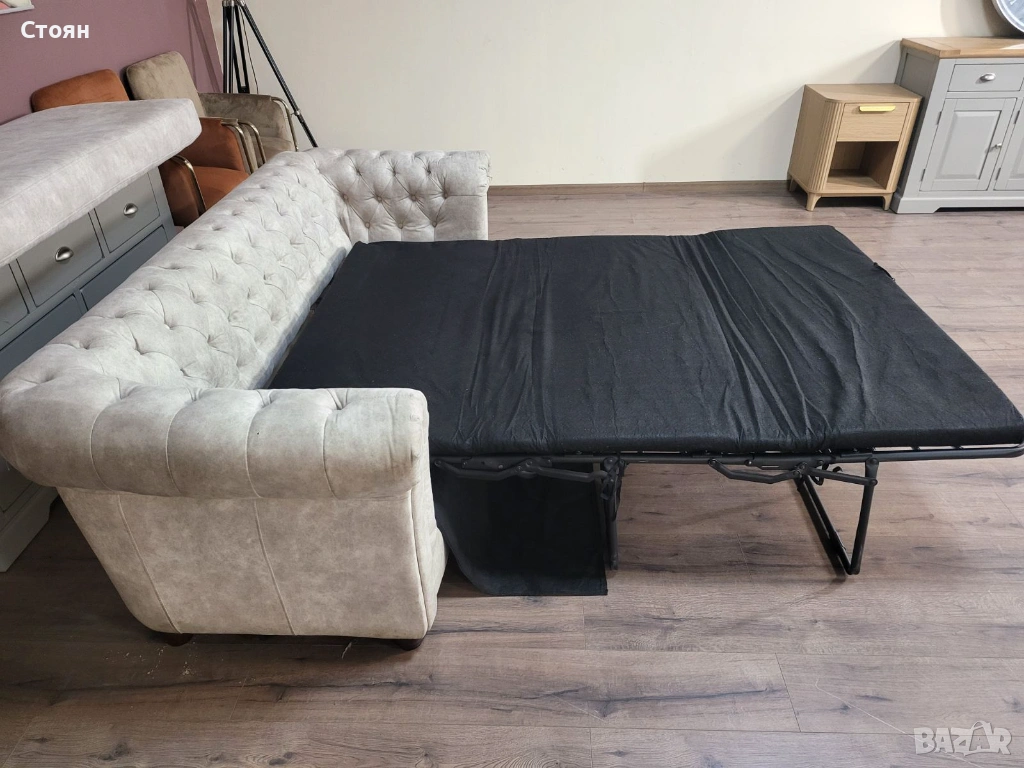 Кремав диван от плат тройка Честърфийлд с функция сън → Обява 53759903
