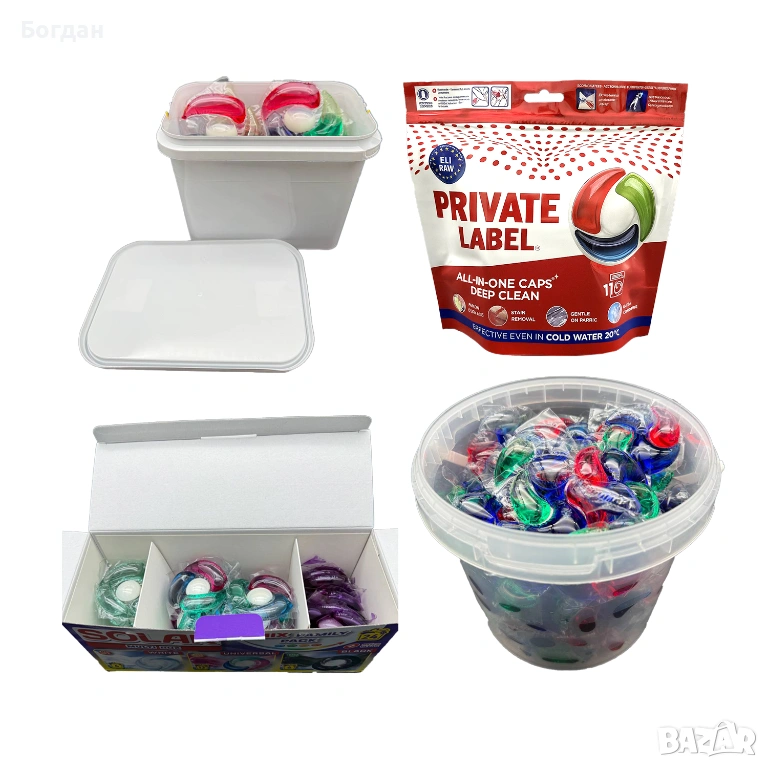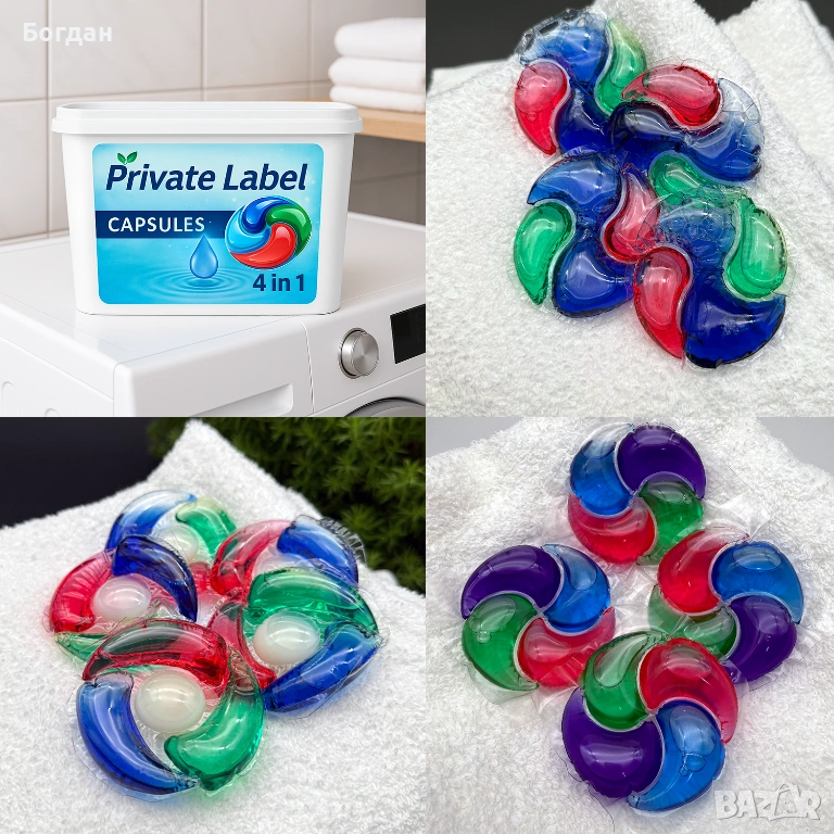 Продукти за пране: Гелове, иновативни капсули (3в1, 4в1), омекотители и прахообразни детергенти.