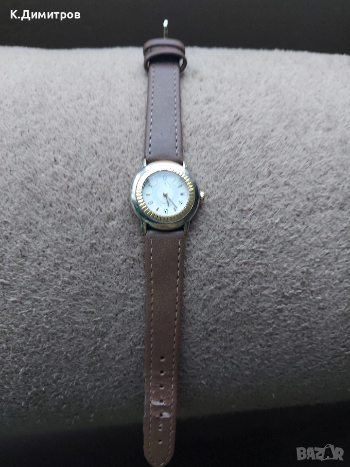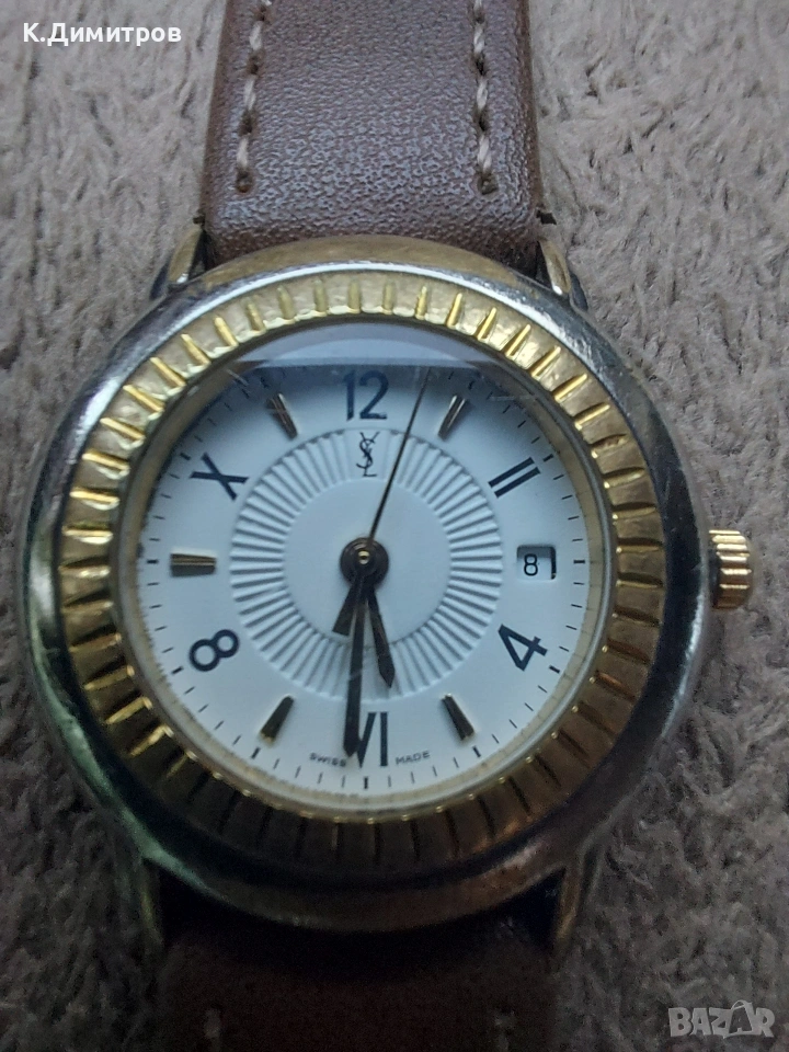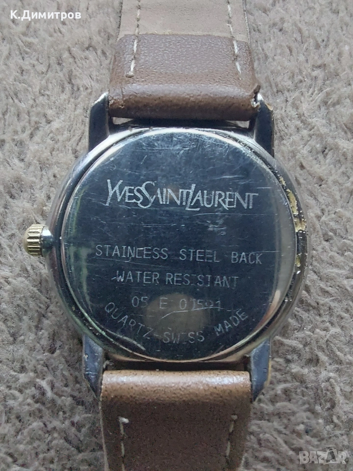 Оригинален Швейцарски часовник.Марка Yves Saint Laurent.Корпусът е от неръждаема стомана,а рамката е позлатена.Диаметър на корпуса 29мм.Произведен в края на 80-те години.