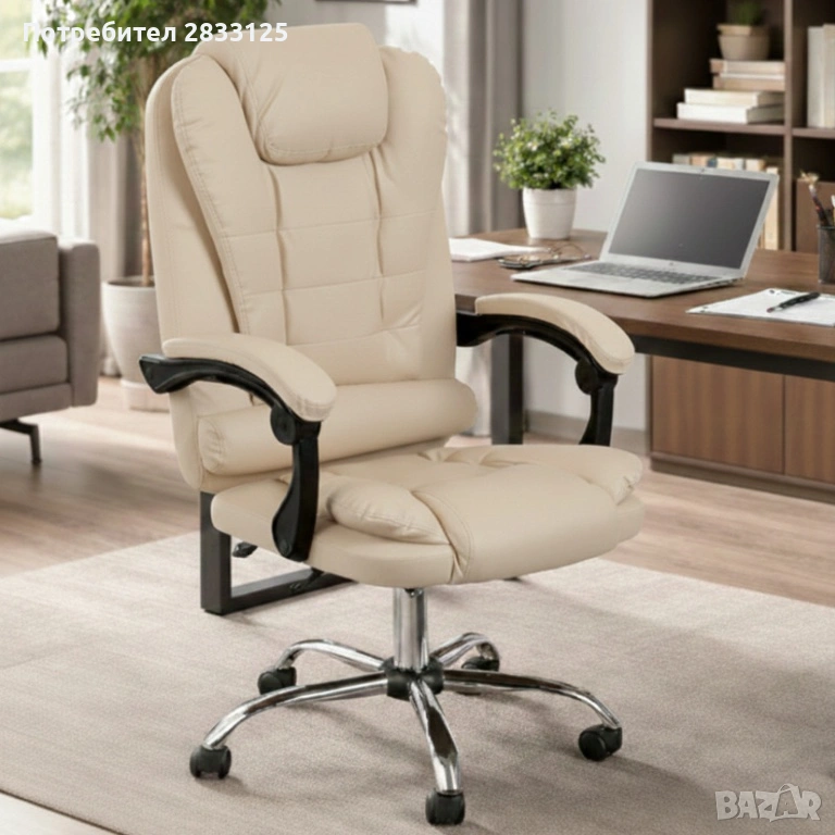 Ергономичен офис стол с лумбална опора от еко кожа в бежов цвят – комфорт за дълги часове без болки → Обява 53760142