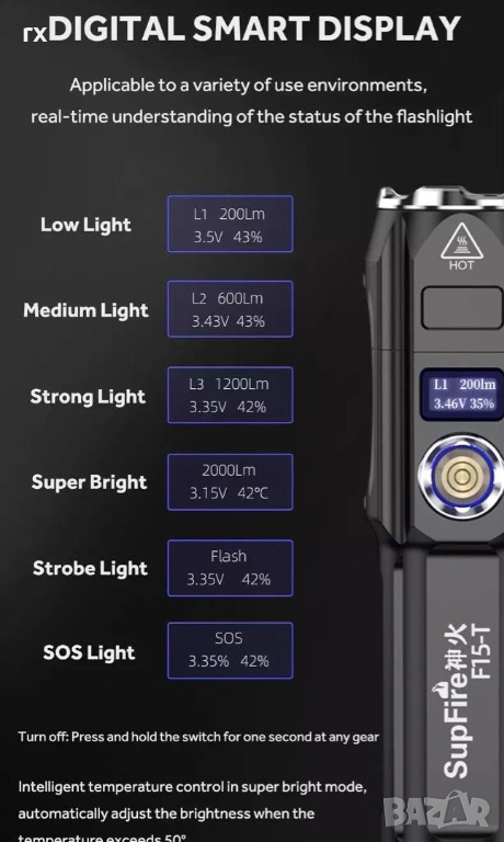 мощен и надежден фенер Superfire F15-T, идеален за къмпинг, лов, риболов или охранителна дейност. Моделът се отличава с изключително солидна изработка и интелигентен дисплей.