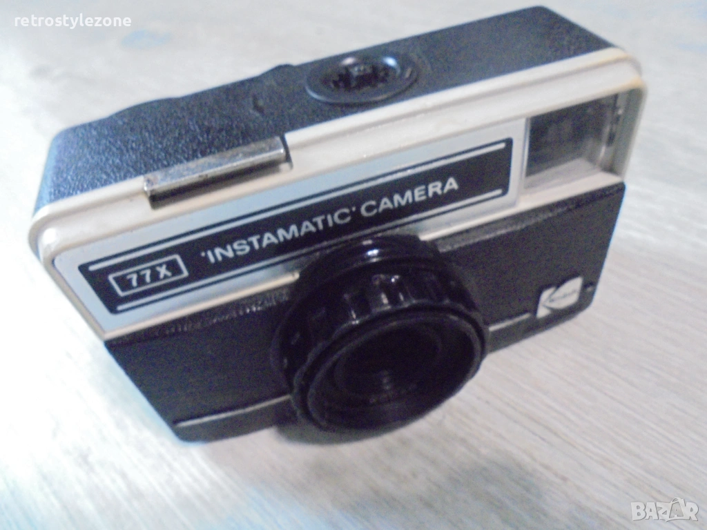 Стар класически винтидж фотоапарат Kodak Instamatic 77X – емблематичен модел от 70-те години. Камерата е компактна и стилна, характерна за серията Instamatic, която прави фотографията масова и достъпна през онова време.