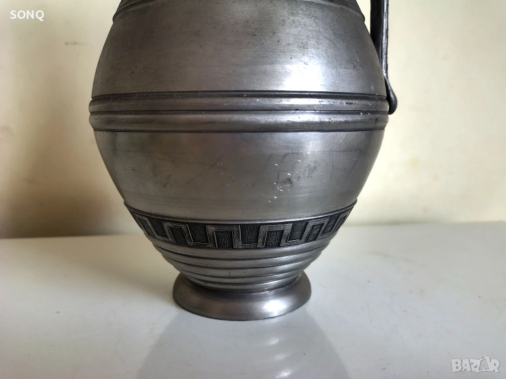 Красива много стара калаена кана. Би била чудесна и като ваза. Налични маркировки. Вместимост 1.4л. Само за ценители и колекционери.