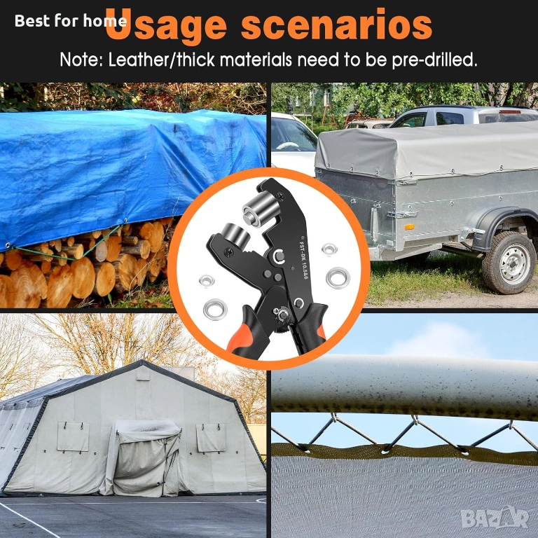 Пробиване на отвори с взаимозаменяеми клещи: Този комплект пробиване на отвори е оборудван със взаимозаменяеми клещи (10 мм и 6 мм), което ви позволява да адаптирате размера на пробиването към различните работни изисквания, като бързо сменяте клещите и директно пробивате отвори за PVC брезенти, платно, картон и други материали.