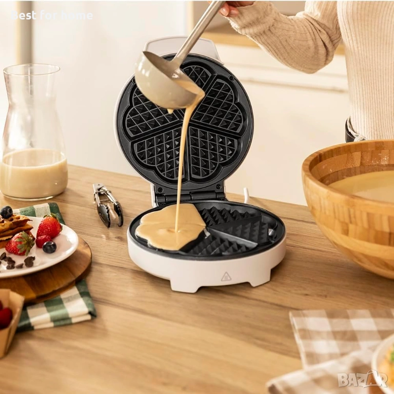 Електрически гофретник с мощност 1000 W за бързо приготвяне на пухкави гофрети; идеален за приготвяне на една голяма гофрета или на пет гофрети във формата на сърце едновременно.