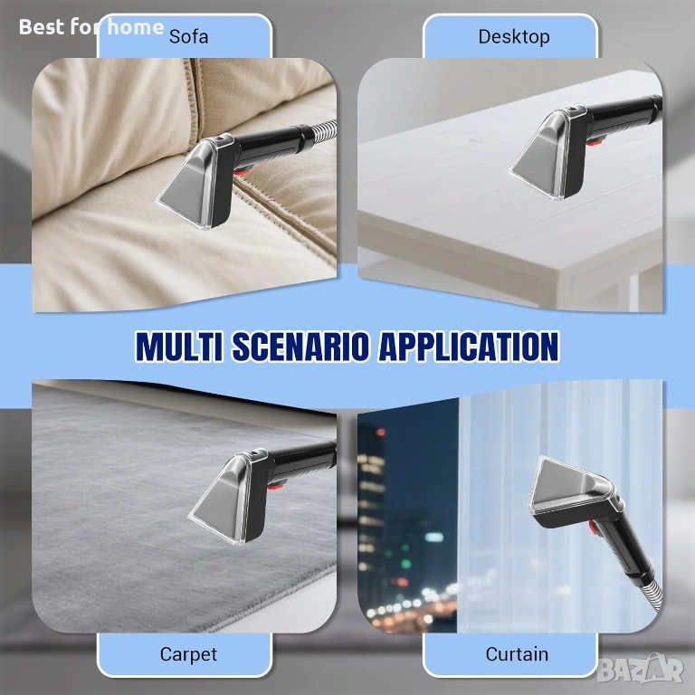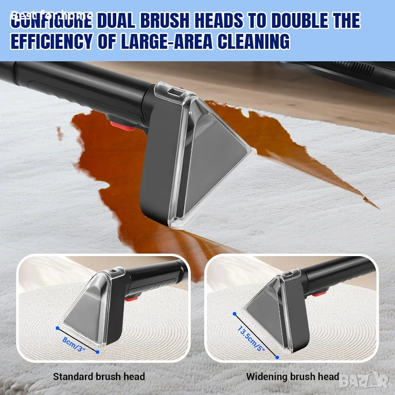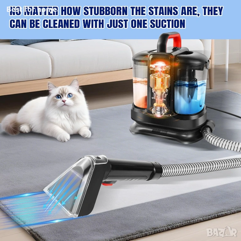 Лесно почистване: Уредът за почистване на килими комбинира функции за търкане и прахосмукачка, за да премахва лесно разливи и петна, съчетани с мощно засмукване и дълбоко почистване. Използвайте специалната приставка, за да премахнете ефективно дори упорити замърсявания за професионални резултати с вашия препарат за почистване на автомобилни седалки.