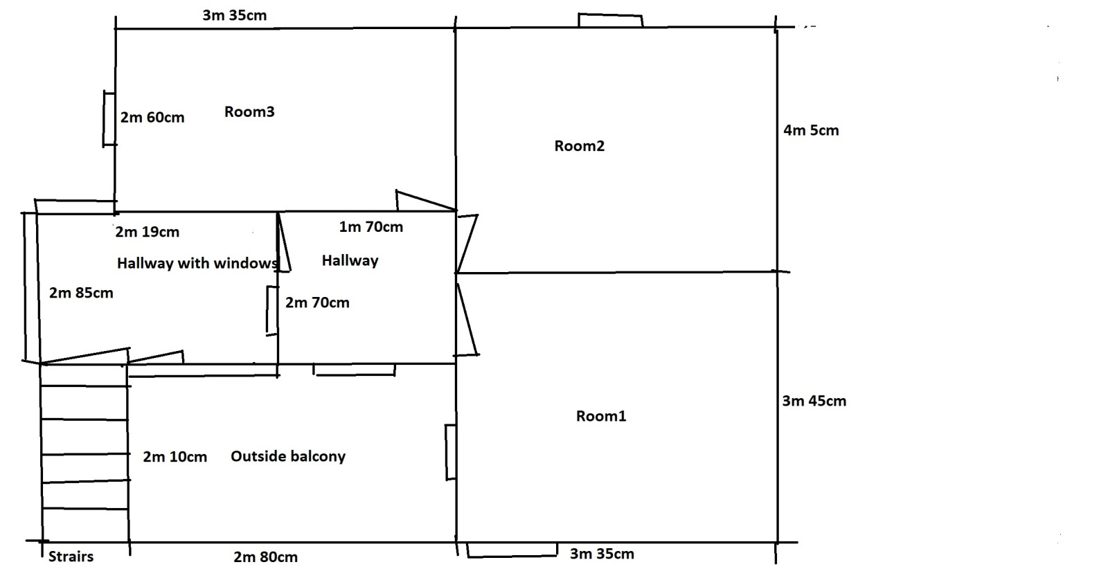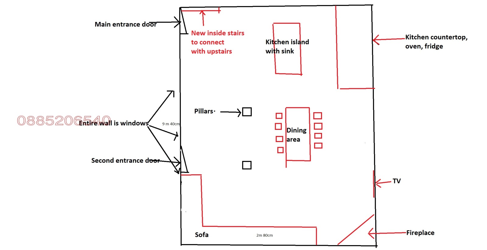 Имотът се състои от къща с отворен план където може да се обособи с кухня, трапезария и хол както е начертано на една от снимките. По външни стълби се влиза в горната част на къщата където има три спални и две обширни предверия.
